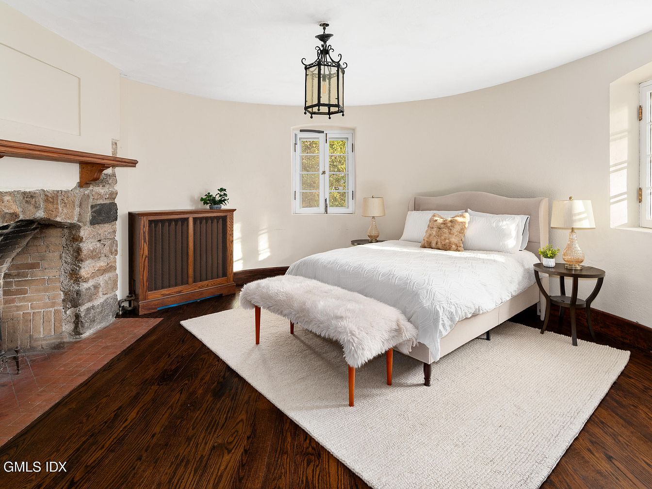 This cozy bedroom features a circular layout and elegant design elements. The soft off-white walls harmonize with rich wooden flooring, creating a warm atmosphere. A plush bed adorned with a quilted white coverlet sits centrally, complemented by decorative pillows. Flanking the bed are stylish side tables with lit lamps, enhancing the inviting ambiance. A fur-accented bench at the foot of the bed provides additional seating. The room showcases a rustic stone fireplace with a wooden mantle, adding character. Several small, vintage windows allow natural light to flood in, illuminating a small potted plant, emphasizing a serene, comfortable retreat.
