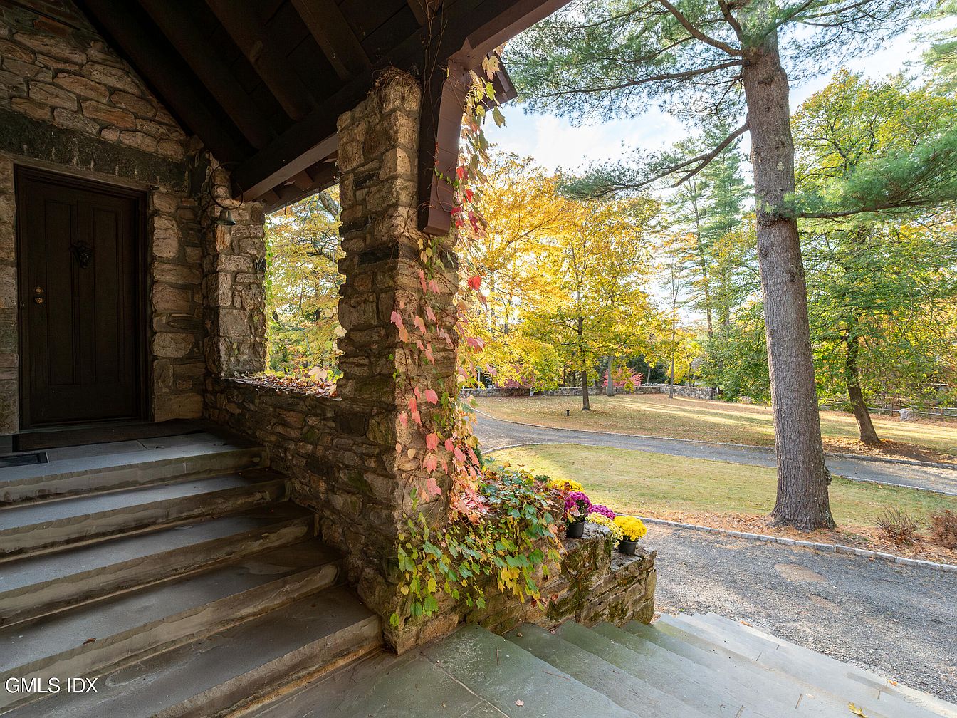 The entrance porch features a rustic stone wall framing a dark wooden door. Stone steps lead upward, lined with creeping ivy that adds a natural touch. Above, a wooden overhang with exposed beams enhances the architectural style. The doorway’s intricate design suggests craftsmanship. In the background, a vibrant landscape unfolds, showcasing autumn foliage in shades of yellow and orange, creating a warm, inviting atmosphere. Flanking the entrance, pots of blooming chrysanthemums add splashes of color, contrasting beautifully with the earthy tones of the stone. This combination of natural elements and construction details embodies classic Americana.