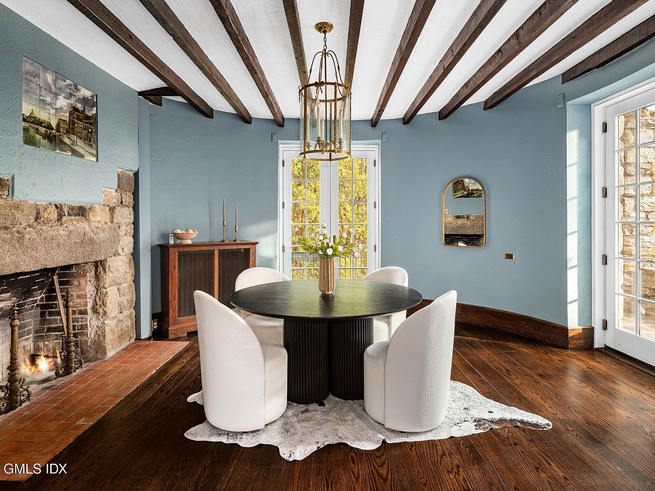 This inviting dining room features elegant exposed wooden beams set against a soft blue wall, creating a cozy and airy atmosphere. A round black dining table is complemented by plush, white upholstered chairs, enhancing comfort. A large window allows natural light to flood the space, illuminating the rustic stone fireplace, which features iron accents and a warm, inviting hearth. A delicate white area rug anchors the furniture arrangement, while a golden pendant light adds a touch of sophistication. Decorative elements like a minimalist wall mirror and tasteful art pieces complete the overall aesthetic, merging modern and traditional styles.