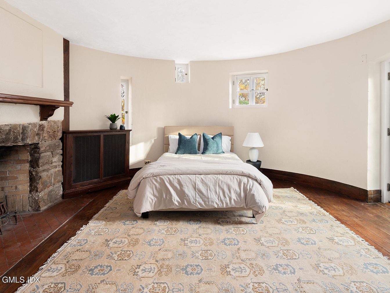 This bedroom features a unique circular design, creating a cozy atmosphere. The wall color is a soft, muted beige, enhancing the room’s warmth. A plush bed, adorned with teal and white pillows, is positioned centrally, complemented by a light-colored, layered bedding. Flanking the bed is a modern bedside lamp providing soft illumination. To the left, a rustic stone fireplace adds character, coupled with a wooden cabinet that houses decorative items. Natural light pours in through small windows, accentuating a beautifully patterned area rug that softens the room’s hardwood flooring, creating an inviting and tranquil retreat.
