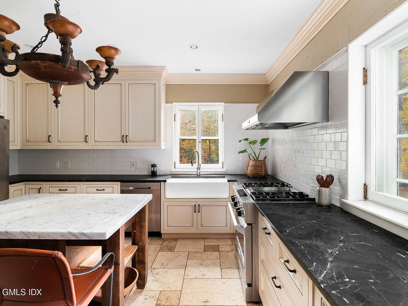 This kitchen features a blend of classic and modern design elements, highlighted by pale cream cabinetry that contrasts with sleek black countertops. A large marble island serves as a functional centerpiece, complemented by rustic wooden legs. The room is illuminated by an ornate chandelier with a vintage aesthetic, enhancing the charming atmosphere. Subtle textured tiles on the walls add depth, while the stainless-steel appliances offer a contemporary touch. A farmhouse sink beneath the window provides practicality and connects the space to the outdoor scenery. Decorative items, including a potted plant, bring warmth and life to the overall design.