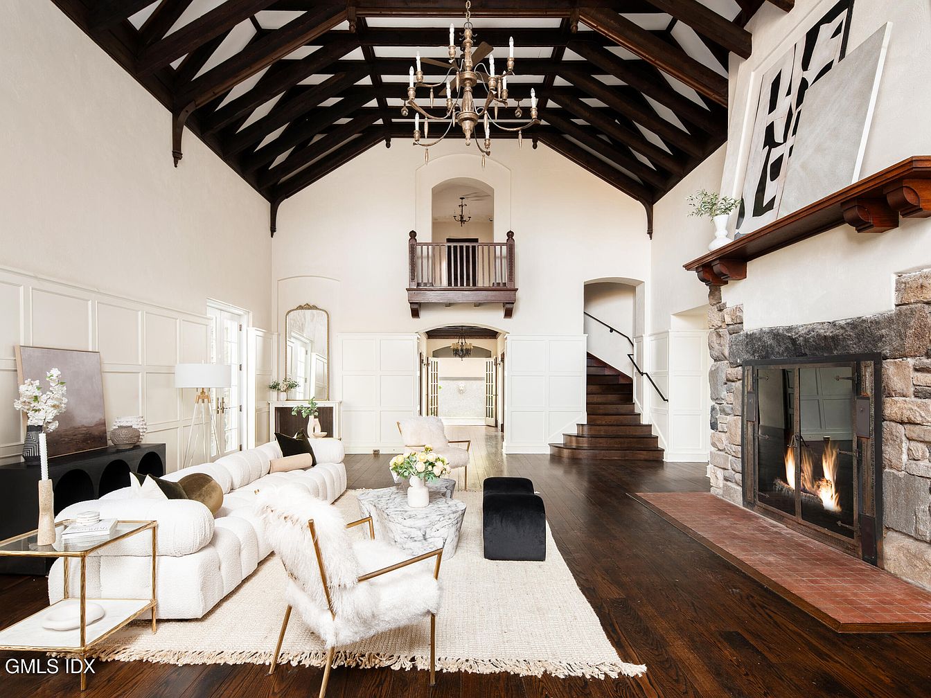 This spacious living room features a stunning vaulted ceiling with exposed wooden beams, enhancing the architectural grandeur. A blend of modern and traditional aesthetics is present, showcasing a large, plush sofa adorned with decorative pillows and a chic marble coffee table. The color palette is neutral, complemented by warm wooden flooring. A stylish black accent chair and a fur lounge chair add texture and contrast. Natural light floods the space through large windows, highlighting the elegant white paneling on the walls. A cozy stone fireplace serves as a focal point, inviting warmth and comfort.