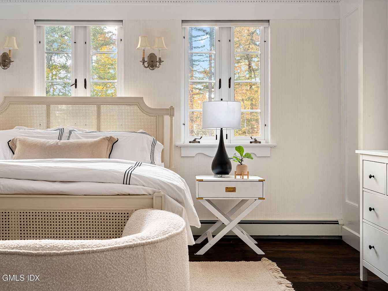 This serene bedroom features a cozy bed with a cane headboard, subtly accented with soft pillows and a white linen duvet. Natural light pours through double-hung windows, framed by delicate sheer shades, illuminating pale beige walls. A bedside table with a sleek black lamp and a charming green plant adds a refreshing touch. Nearby, a plush, rounded chair provides a comfortable seating area. Hardwood floors in dark tones contrast the light color scheme, while a textured area rug softens the space. Elegant wall sconces add warmth, enhancing the inviting atmosphere of this peaceful retreat.