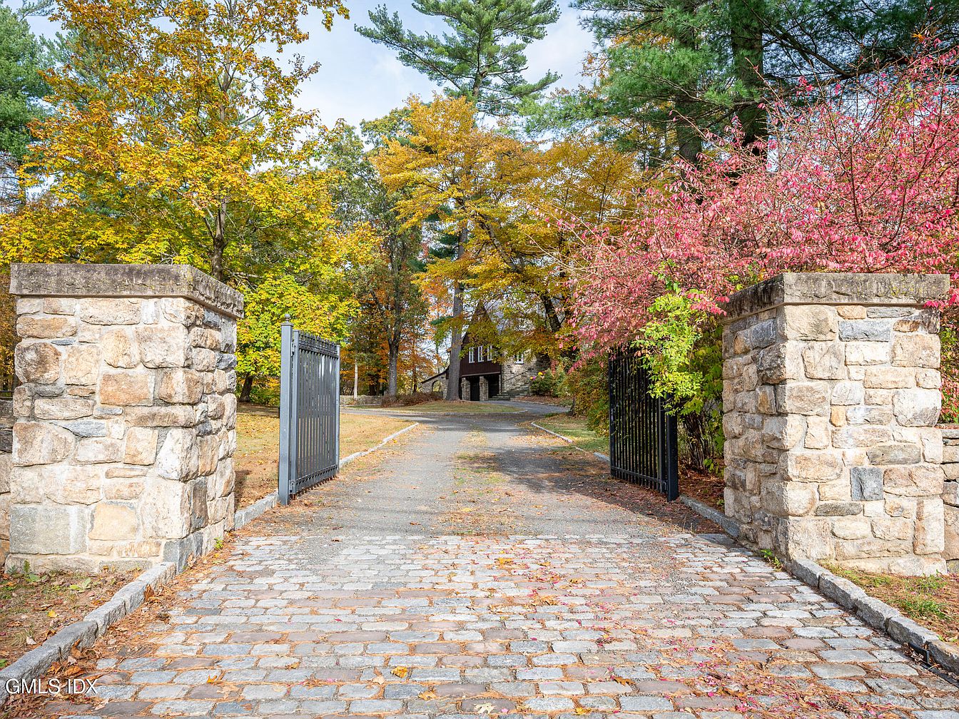 A stone entrance features sturdy pillars flanking a wrought iron gate, creating an inviting threshold to the property. The cobblestone pathway leads up to the gate, bordered by a mix of vibrant trees showcasing autumn hues of orange, yellow, and red. The natural landscape enhances the rustic charm of the stonework, which displays unique textures and colors. Beyond the gate, glimpses of a historic house are visible, nestled among the foliage. This setting evokes a warm, welcoming atmosphere, blending seamlessly with the serene countryside, making it an appealing entry point to the home.