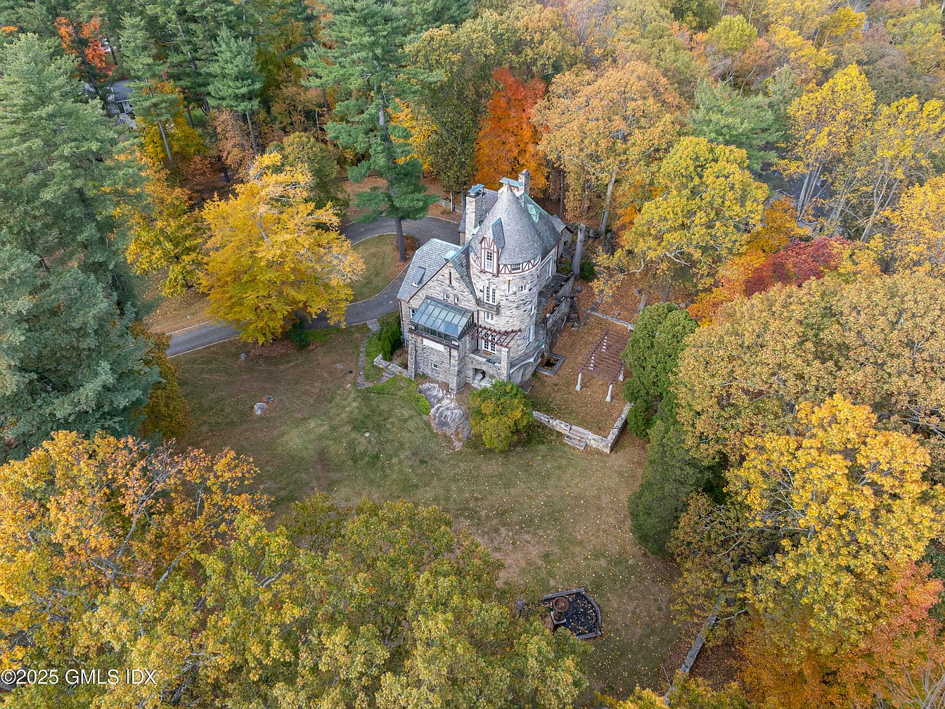 Aerial view of a historic American home surrounded by vibrant autumn foliage. The stone structure features intricate architectural details, such as a steeply pitched roof adorned with a dark green hue, and decorative woodwork. A prominent turret rises, adding to the castle-like charm. The expansive yard showcases a mix of manicured lawn and rustic boulders, enhancing the natural landscape. Lush trees exhibit shades of yellow, orange, and red, creating a picturesque outdoor setting. A winding path invites exploration, leading to features like a small fountain hidden amongst the greenery, adding tranquility to this historic estate.