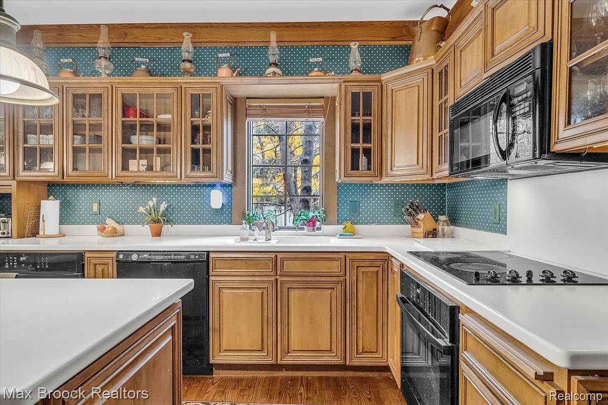 This kitchen blends classic charm with modern functionality. Light oak cabinetry features glass-front doors, showcasing decorative dishes. The rich blue wallpaper with white polka dots adds whimsy, complemented by the warm, wooden trim. A wide window invites natural light, framed by a wooden sill and adorned with houseplants. A white countertop contrasts elegantly with dark appliances, while muted colors ensure a cozy atmosphere. A selection of vintage kitchenware adorns the shelves, enhancing the rustic appeal. The space is efficiently organized, allowing for seamless movement with a well-placed sink, stove, and dishwasher, fostering a warm culinary environment.