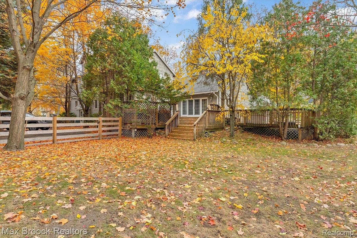 A picturesque view of a garden area surrounding a charming historic home. The foreground is covered with colorful autumn leaves, transitioning from vibrant yellows to deep reds, creating a warm and inviting atmosphere. A wooden fence lines the property, adding rustic charm. The house, partially hidden by trees, features traditional architecture with a pitched roof and multiple windowed facades. A wooden deck with steps leads to the home, inviting outdoor gatherings. Surrounding trees blend lush greens with fall colors, enhancing the serene outdoor ambiance. This space exemplifies the beauty of nature in a residential setting.