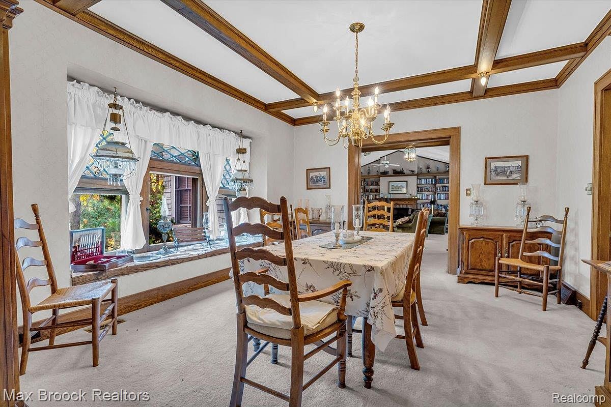 A well-appointed dining room featuring a wooden dining table surrounded by six ladder-back chairs. The table is elegantly set with delicate glassware. Natural light floods the space through large windows dressed with sheer white curtains, offering a view of the garden outside. Architectural details include a coffered ceiling with wooden beams that enhance the room’s character. The walls are painted in a soft, neutral hue, complementing the hardwood floors. A vintage chandelier hangs overhead, providing warm illumination, while an adjoining room offers a glimpse of bookshelves and additional seating, suggesting a welcoming atmosphere.