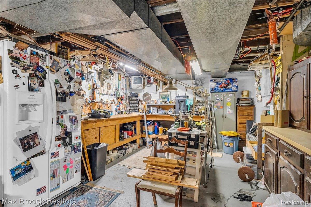 A cluttered garage workshop filled with various tools and items. The layout showcases a long wooden workbench lined with tools, storage bins, and multiple hanging cords. A white refrigerator decorated with magnets and photos stands against one wall, while shelves hold assorted items and a television hangs above the workspace. The ceiling is low with metallic ductwork visible. The flooring is concrete, partially covered by a rug. In the center, a wooden chair holds stacked wooden planks, creating a rustic and utilitarian atmosphere, highlighting the space’s purpose as both a workshop and a storage area.
