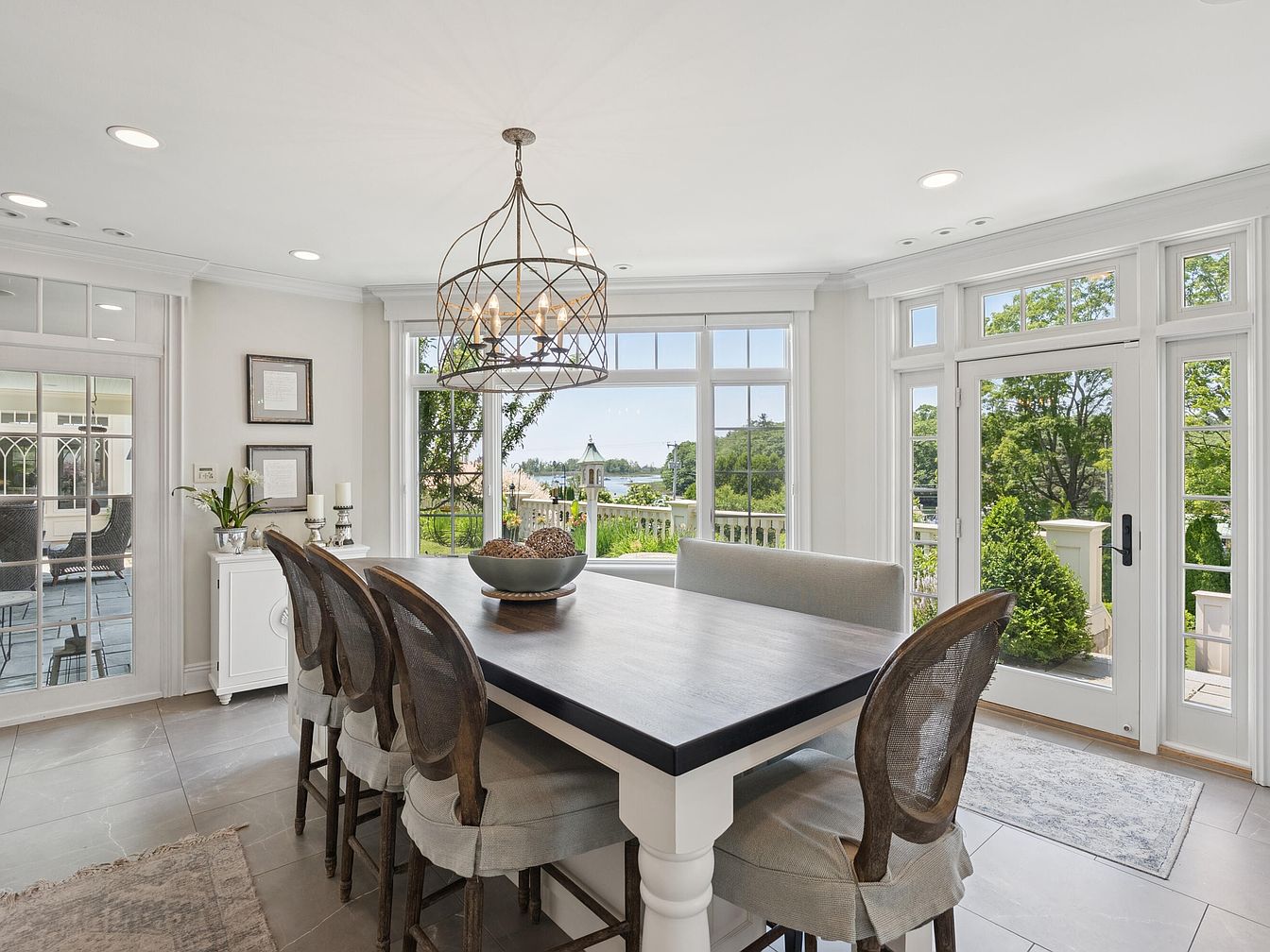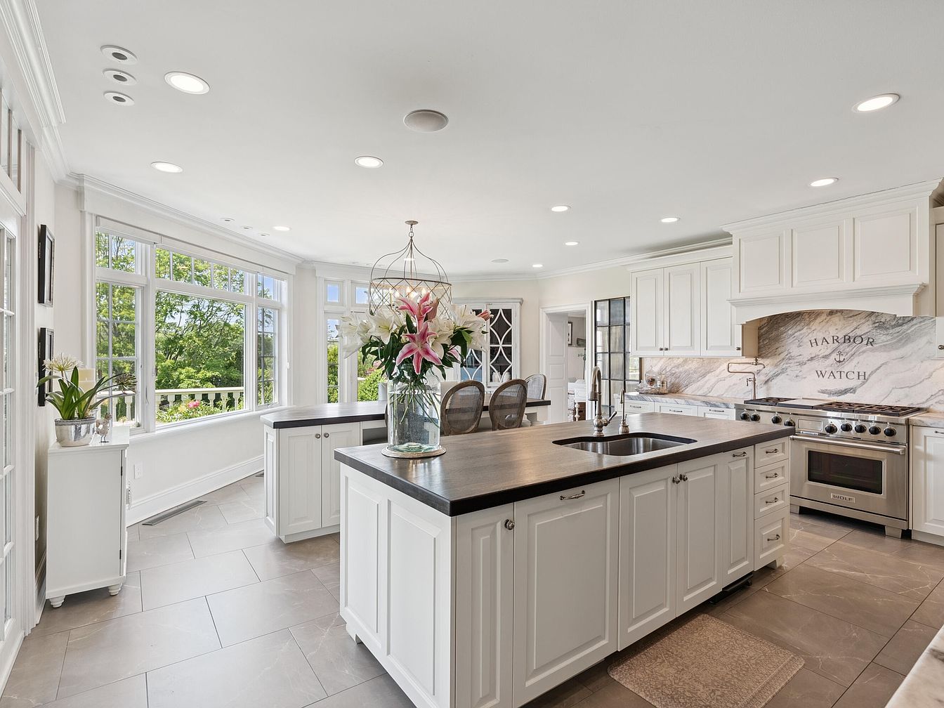 Large, sunlit kitchen with expansive windows along one wall, offering views of a green garden outside. White cabinetry and paneling dominate the space, giving it a bright and airy atmosphere. A black countertop island with a stainless-steel sink sits at the center, topped with a glass vase of pink and white lilies and a metal cage chandelier above. Light gray porcelain tile floors complement the white cabinets. The cooktop area features a marble backsplash carved with the words ‘Harbor Watch.’ Dining chairs with wooden seats are visible toward the back, blending traditional elegance with contemporary comfort.