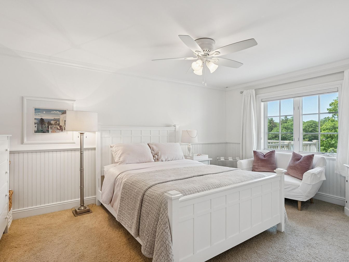 A serene bedroom with a bright, airy atmosphere, featuring white beadboard paneling on the lower walls and pale neutral carpeting. The white wooden bed, dressed in soft beige and blush linens, sits centrally beneath a ceiling fan with five white blades and frosted light shades. A matching white dresser and bedside tables complement the room’s clean lines and coastal-inspired charm. By the large window, which lets in natural light and frames views of lush greenery outside, stands a white loveseat accented with pastel mauve pillows. Minimalist artwork and a brushed metal floor lamp add subtle modern touches.