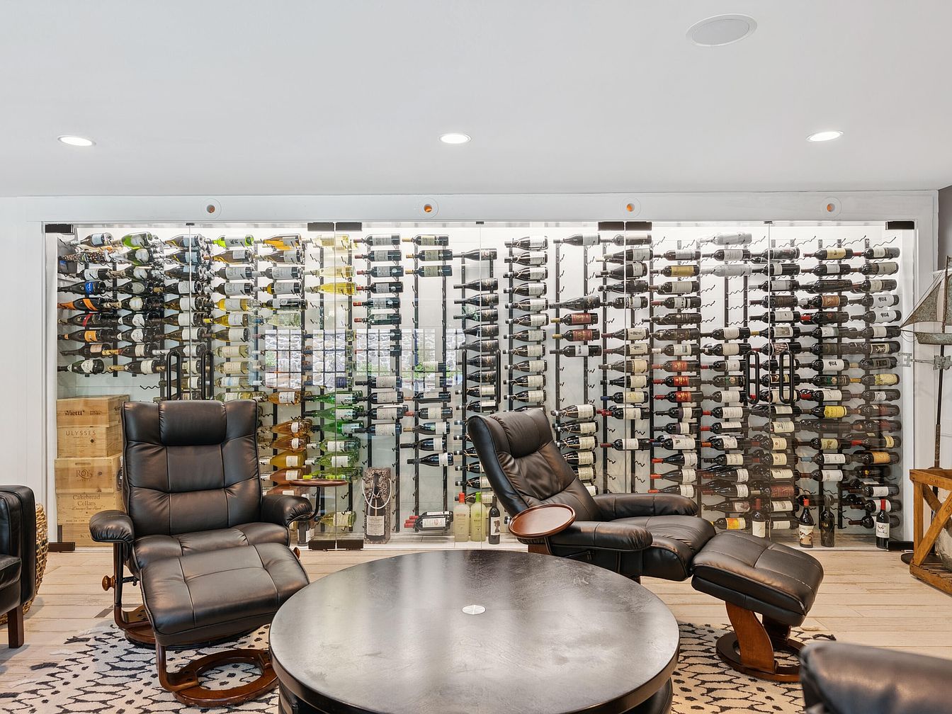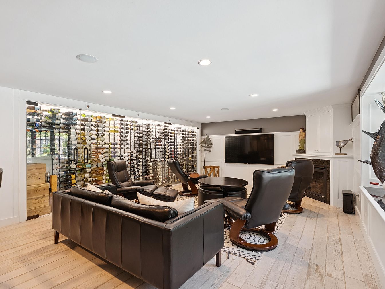 An inviting lounge features a wall-sized glass wine cellar with an array of bottles displayed on horizontal metal racks, accentuated by natural light. The area is centered around a large, wall-mounted flat screen television set above a modern black fireplace, surrounded by white paneled cabinetry and trim. Furnishings include a sleek black leather sofa and matching recliners with wood bases, arranged around two round black coffee tables on a geometric-patterned area rug. The room is finished with wide-plank light wood floors, recessed ceiling lights, and decorative accents including sculptures and wine crates, creating a sophisticated, welcoming ambiance.