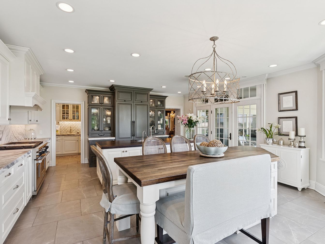 A bright and spacious kitchen features a central island topped with warm wood, paired with upholstered dining chairs and a bench for casual seating. Cabinets are painted white, with a contrasting deep gray cabinetry anchoring the back wall, and a marble backsplash and countertops lending a luxurious touch. Overhead, a large, decorative chandelier adds elegance above the island. The room is illuminated by numerous recessed ceiling lights and natural light streaming through large glass-paneled doors. Accents like fresh flowers, framed prints, and candles create a welcoming, refined atmosphere against neutral walls and glossy tiled floors.