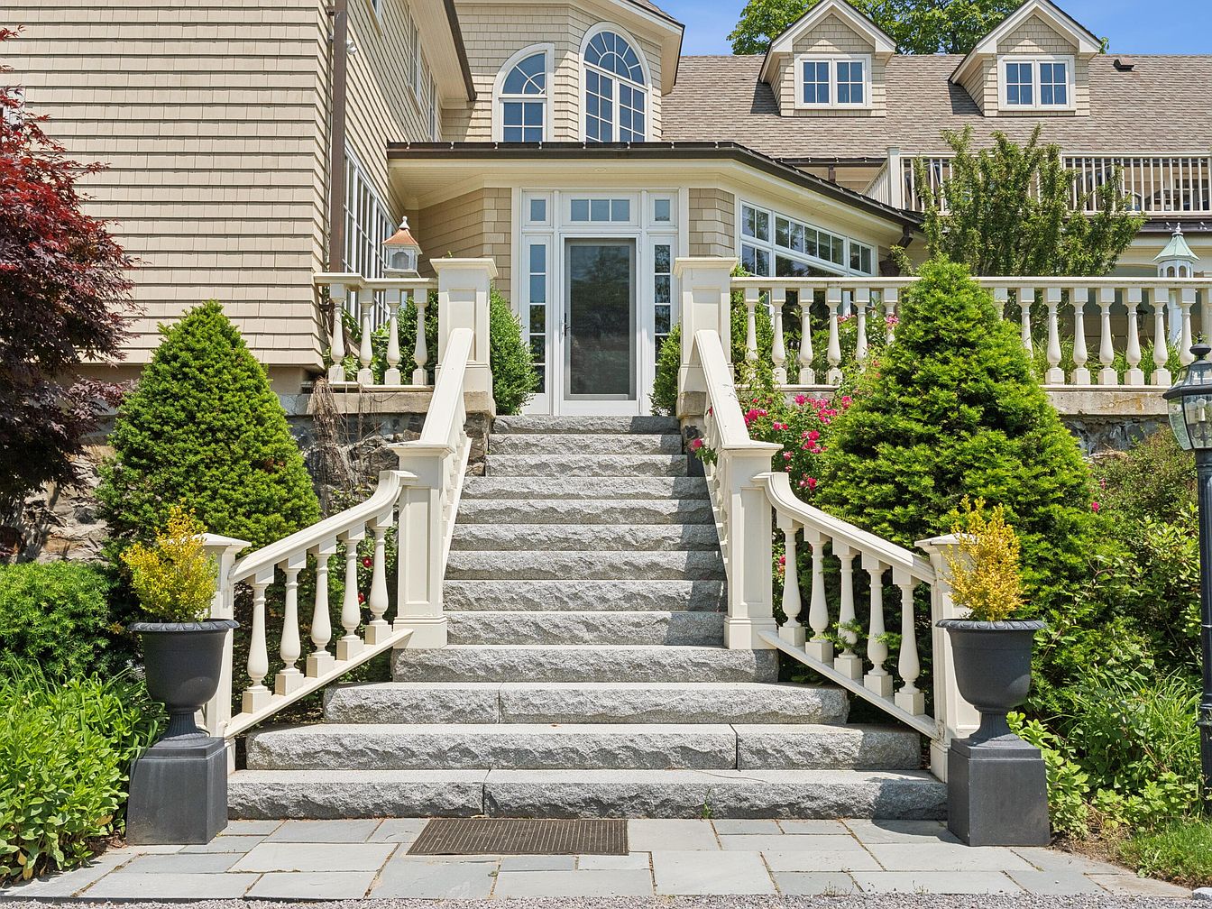 A grand staircase of wide, gray stone steps leads up to the entryway of a historic home. The steps are flanked by elegant cream-colored railings with classic balusters, topped at the foot by large, square planters holding small yellow-green shrubs. Manicured, conical evergreen bushes and flowering plants accent both sides of the stairs, bordered by lush landscaping. The siding of the house is a light tan shingle, complemented by white trim and decorative columns. A wall of tall windows and a glass door provide a welcoming focal point, while dormered windows punctuate the roof above. The overall look is stately, fresh, and inviting.
