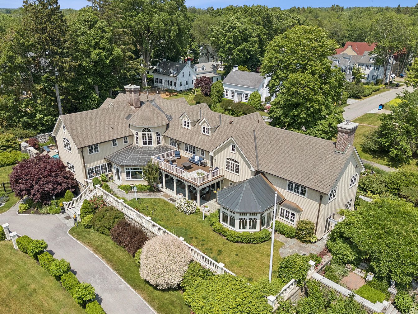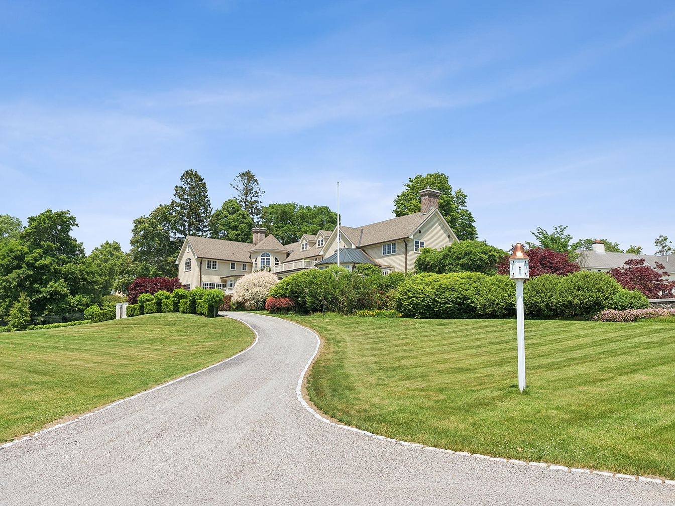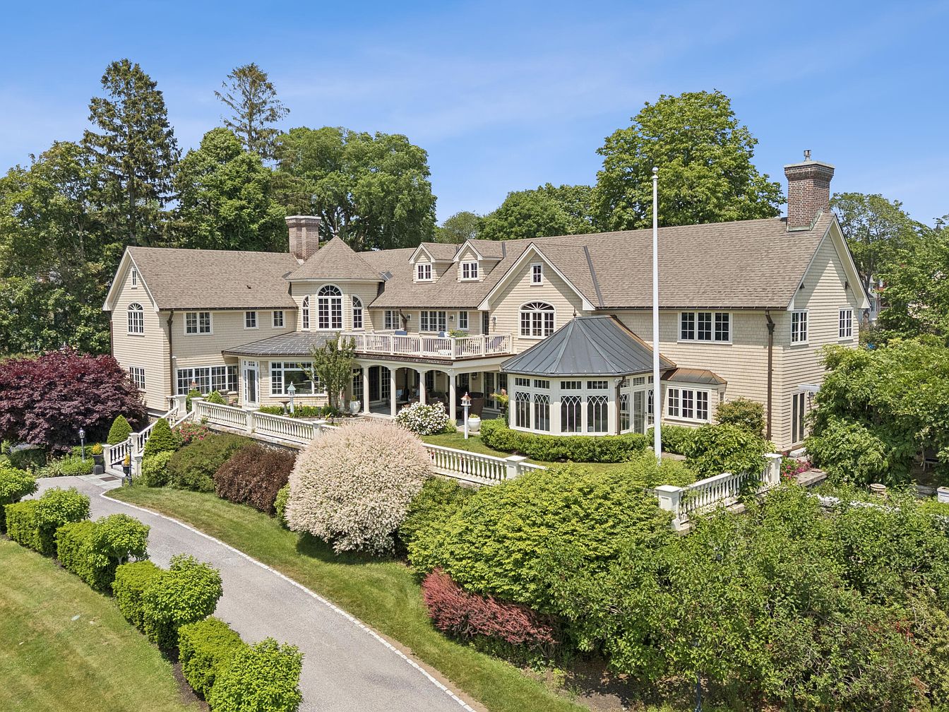A large, historic American home built in a classic architectural style sits among lush greenery and mature trees. The exterior features taupe-colored siding, white trim, and multiple gable roofs accented by dormer windows and tall brick chimneys. The beautifully manicured front yard boasts a mix of rounded shrubs, flowering bushes, and neatly trimmed hedges. An elegant driveway leads to a three-car garage with carriage-style doors. The house has scenic water views, with a marina full of boats and a dense forest beyond. The landscape is spacious, open, and impeccably maintained, providing both privacy and grandeur.