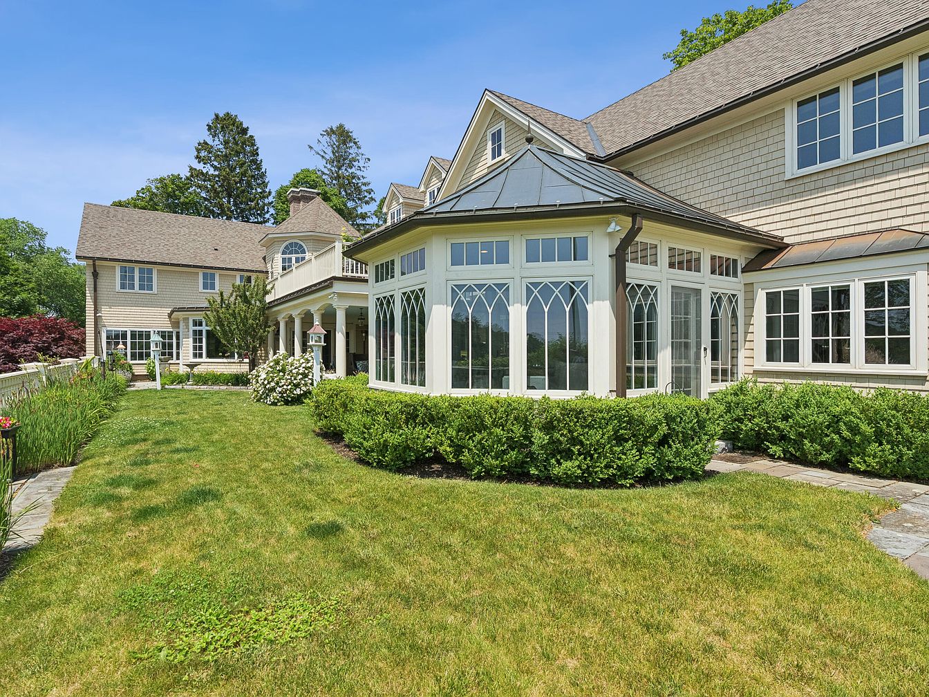 A beautifully manicured lawn stretches alongside the house, bordered by lush green shrubs and neatly trimmed landscaping. The prominent sunroom features tall, arched windows with decorative muntins, allowing for abundant natural light and impressive views from within. Cream-colored wood siding pairs with a classic shingled roof, topped by a metal accent roof on the sunroom. White trim around the windows and doors contrasts gently with the beige exterior. The overall design brings together historic charm and fresh landscaping, accented by mature trees in the background and a serene, inviting atmosphere throughout the space.
