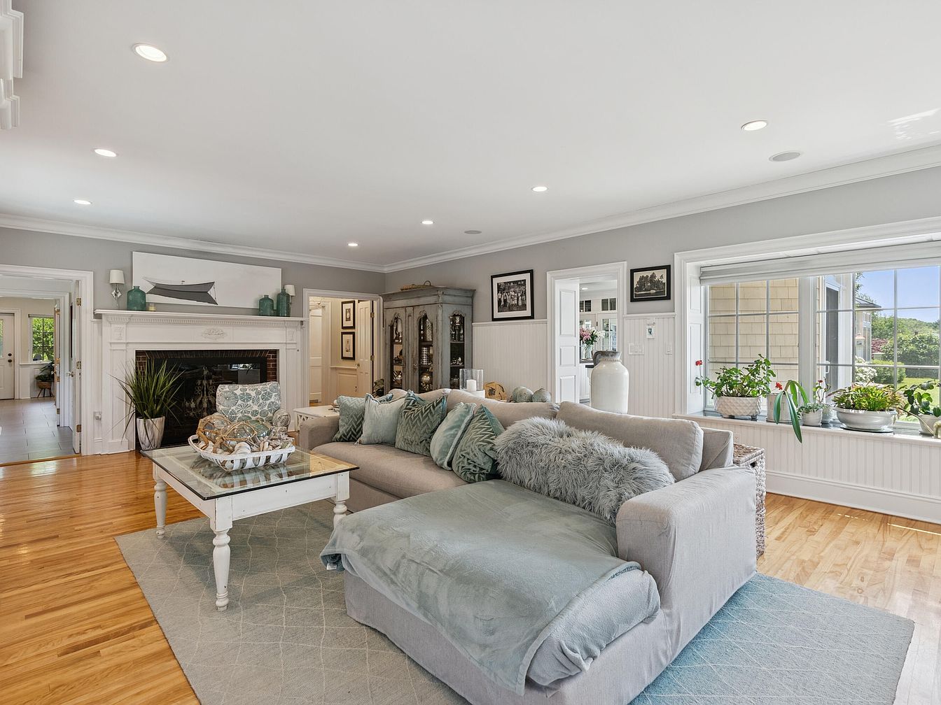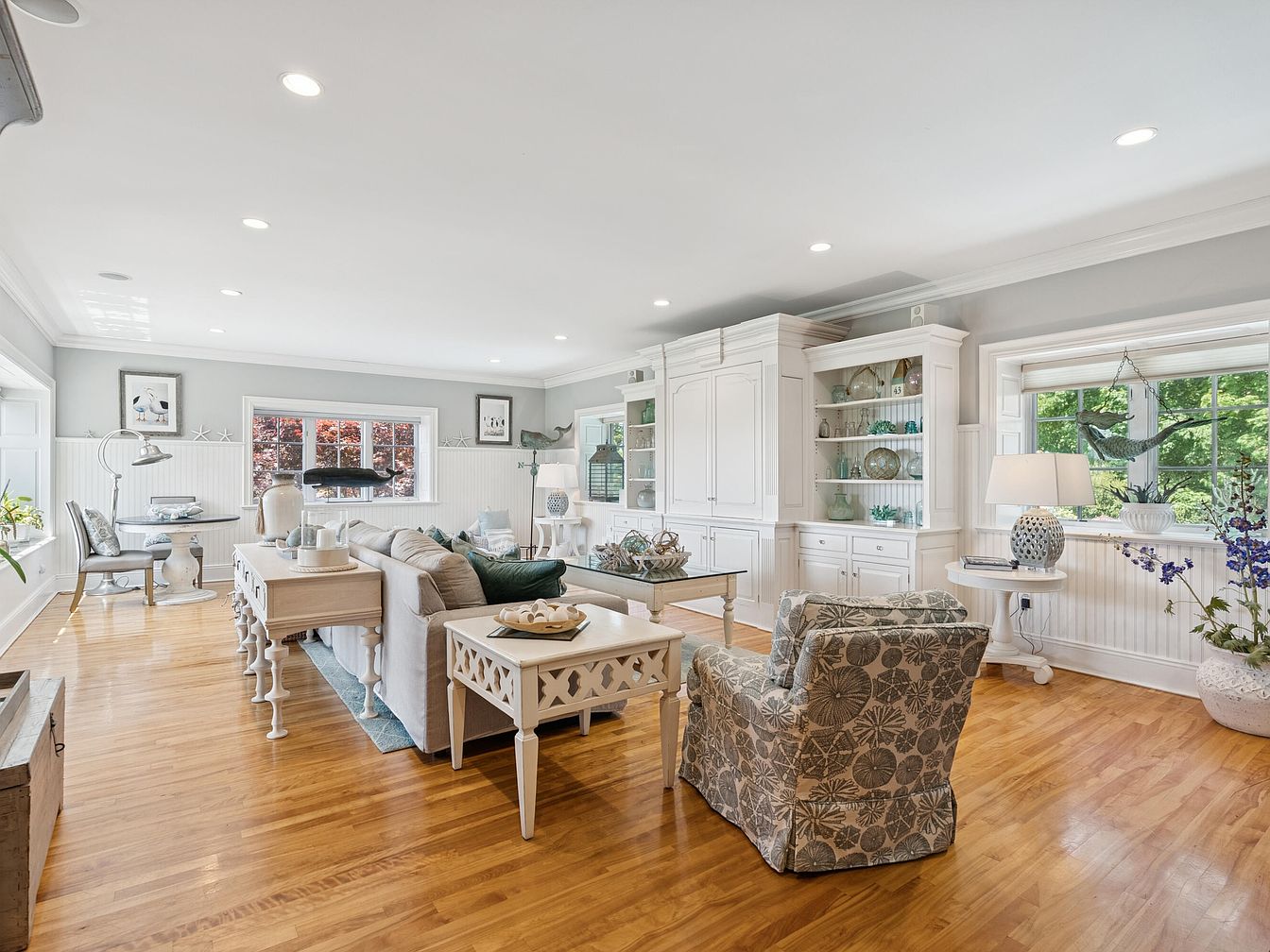 A spacious, sun-filled living room with polished hardwood floors and a soft, neutral color palette dominated by shades of white, grey, and light blue. The room features a large, comfortable sectional sofa with green accent pillows, a patterned armchair, and elegant side tables with intricate cutout designs. Built-in cabinetry with glass shelving displays decorative glassware and pottery, while wainscoted walls add a classic touch. Multiple windows allow plenty of natural light, and views of greenery outside enhance the serene atmosphere. Finishing touches include table lamps, floral arrangements, and nautical-themed décor, creating a welcoming, coastal-inspired ambiance.