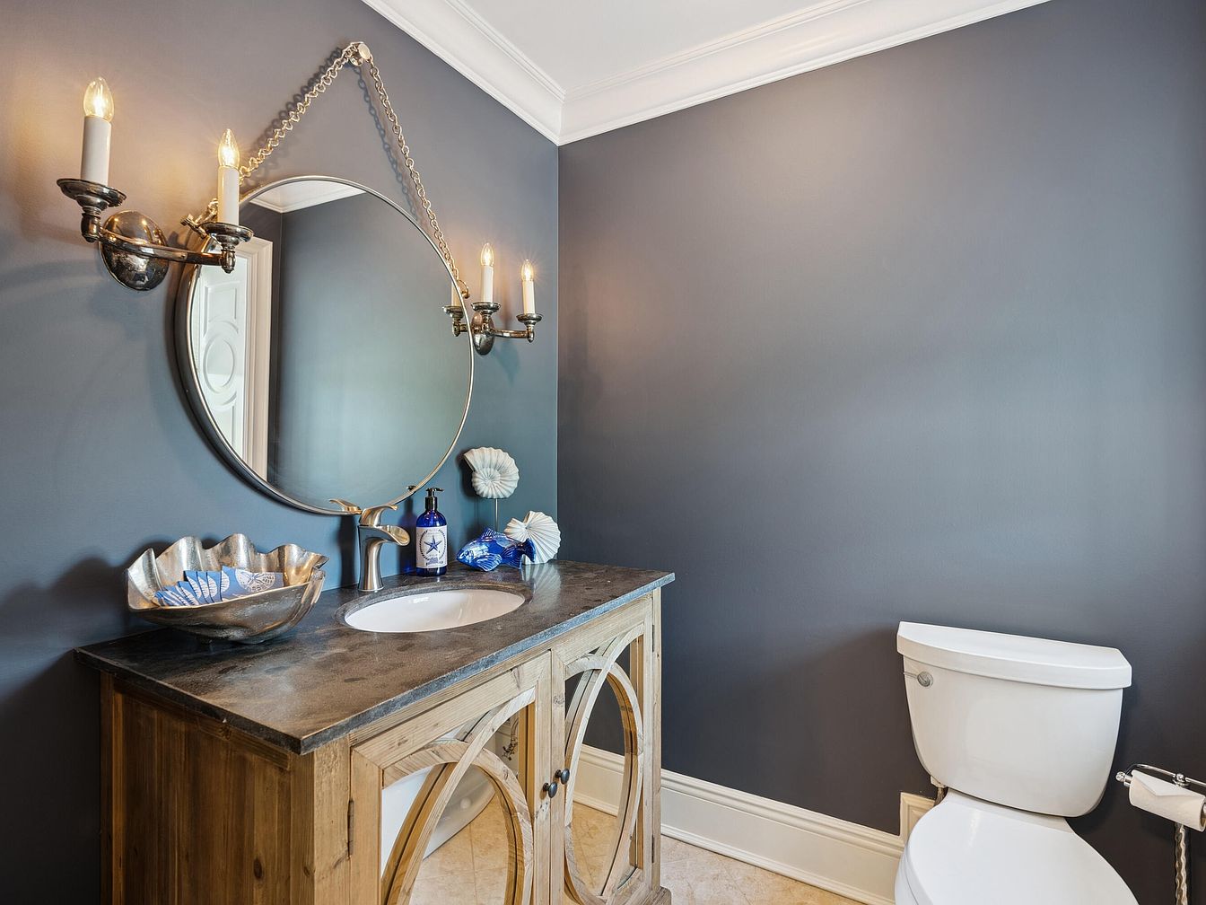 A small bathroom featuring a rustic wooden vanity with a dark stone countertop and an under-mount white sink. A large round mirror hangs above the sink, suspended by a decorative chain and flanked by two wall-mounted candle-style sconces that emit warm light. The walls are painted a deep, muted blue-gray, providing a modern contrast to the classic white crown molding and baseboards. Nautical accessories, such as a shell-shaped dish and ocean-themed soap, accent the countertop. The white toilet sits opposite the vanity, and the pale tile floor adds a bright, subtle touch to the space.