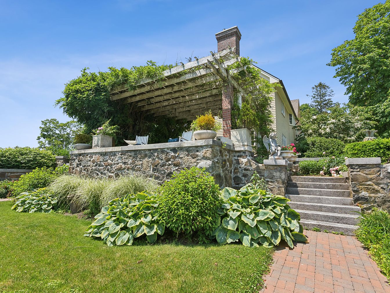 A stone patio terrace elevated above a lush green lawn, bordered by ornamental grasses and leafy perennial plants. Broad granite steps with stone railings lead up to the terrace, flanked by sculpted urn planters and a decorative stone statue. A wooden pergola, covered in thriving vines, creates partial shade over the sitting area furnished with classic white chairs and a small table. The exterior of the house is painted a soft cream color, blending seamlessly into the vibrant garden. Blue skies and dense greenery add to the inviting, tranquil atmosphere of this outdoor living space.