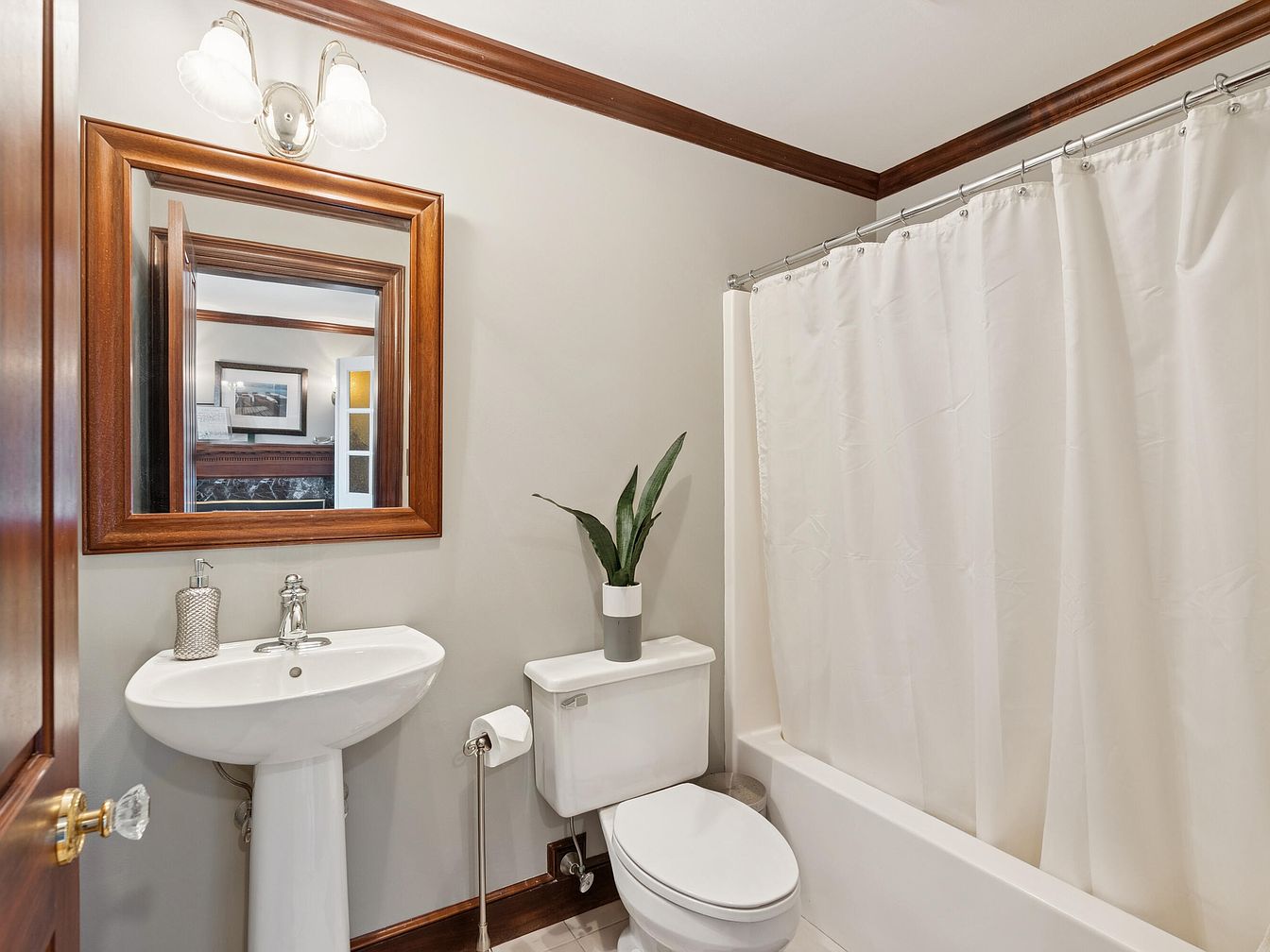 A compact bathroom displays a classic and clean design with white fixtures and rich wood detailing. The pedestal sink and toilet stand against soft gray walls, framed by dark wood trim along the ceiling and around the large mirror above the sink. A chrome light fixture with frosted glass shades sits over the mirror, providing ample illumination. The bathtub features a simple white curtain on a chrome rod, while a small green plant in a white pot adds a touch of nature atop the toilet tank. The overall ambiance is fresh and inviting, evoking a timeless, traditional style.