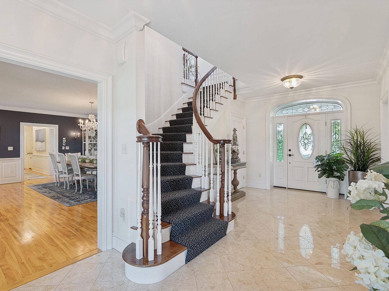 A spacious entryway with a sweeping, curved staircase topped with a dark wood banister and white balusters. Glossy marble-look tile floors reflect natural light streaming through an ornate front door with oval stained glass panels. To the right, tall potted plants add a touch of greenery beside the entrance, and a decorative console table sits along the wall. Beyond the entry, an open doorway leads to the dining room, where navy blue walls, wainscoting, and a crystal chandelier create a formal atmosphere. The color palette is primarily crisp white with elegant, classic detailing and luxurious textures.