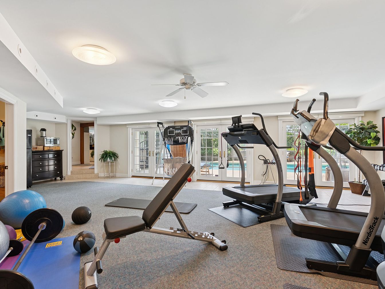 A spacious home gym filled with natural light from a wall of large glass doors that open to an outdoor pool area. The room features two treadmills, a weight bench, free weights including barbells and medicine balls on colorful mats, and a basketball hoop set for indoor play. The space is carpeted in a neutral gray, with soft white walls and recessed lighting for a clean, bright look. Potted plants add fresh greenery near the entryways, and a black dresser and water dispenser are tucked into one corner, providing functionality and a touch of home comfort.