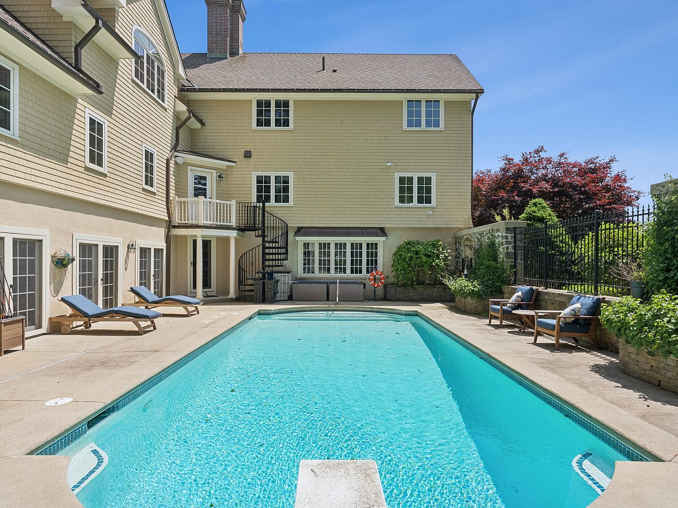 A spacious outdoor swimming pool is surrounded by a concrete patio, with lounge chairs on the left side and cushioned armchairs along a stone wall to the right, creating a comfortable lounging space. The house exterior is clad in classic tan siding and creamy stucco with white trim, featuring multiple large windows and French doors that open to the patio. A black wrought iron fence and lush greenery provide privacy, while a spiral staircase adds architectural interest leading to a small balcony above. The overall atmosphere is elegant yet relaxed, perfect for enjoying sunny days in a private, serene setting.