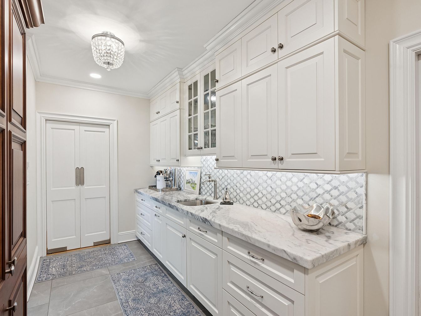 A narrow space with elegant, classic design, this butler’s pantry features abundant white shaker-style cabinetry lining both the upper and lower walls. Marble countertops stretch the length of the room, paired with a sophisticated geometric tile backsplash in shades of white and grey. A double stainless steel sink is set into the counter, with a coffee machine and silver decorative bowl adding subtle accents. Glass-front cabinet doors above the sink allow for display of glassware. The floor is finished with large, soft-grey tiles and two vintage-inspired area rugs. Overhead, a crystal chandelier adds a touch of traditional glamour to the crisp, clean palette.