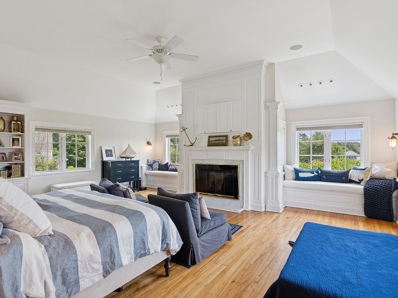 A spacious bedroom with a bright, airy atmosphere features a central white fireplace set into an ornately paneled wall. The hearth is flanked by two built-in window seats, each cushioned and decorated with navy and white pillows, enhancing a coastal or nautical vibe. Light hardwood floors add warmth, while white-painted walls and trim create an open, restful feel. A striped bedspread in muted blue and gray rests on a bed near the fireplace; two dark blue lounge chairs face the hearth. The room includes built-in shelving, elegant brass accents, and views of trees through large windows, providing both comfort and charm.