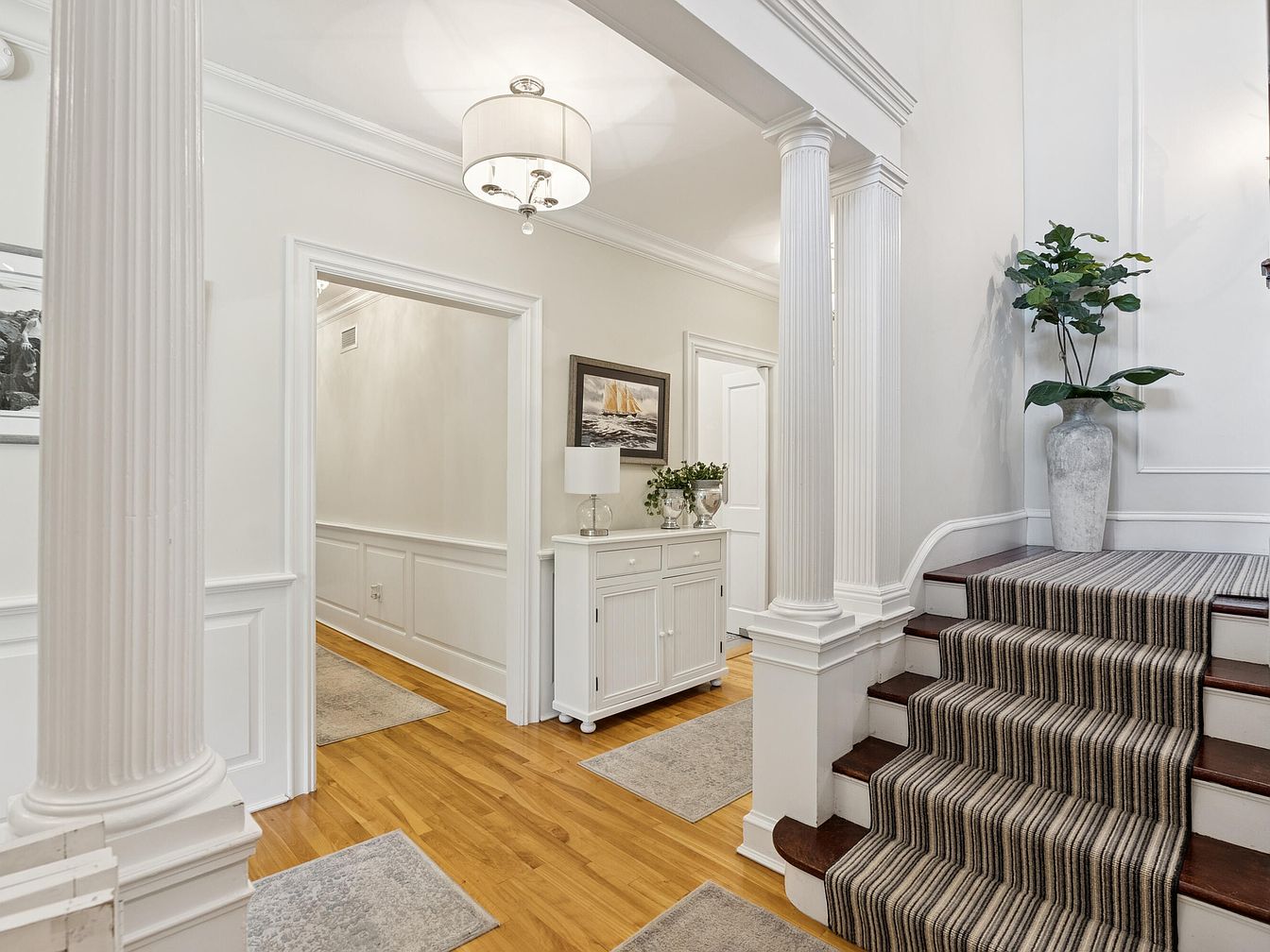 A bright entryway featuring classical white columns and wainscoting along the walls. The space is painted in a soft, creamy white with natural hardwood flooring and neutral area rugs lining the hallway. To the right, a staircase with a striped carpet runner leads upward, bordered by paneled walls. A tall, elegant vase with leafy green foliage adds a touch of freshness at the top of the stairs. Straight ahead, a small white console table holds a lamp, framed artwork depicting a sailboat, and silver decorative accents, enhancing the welcoming and traditional aesthetic of the foyer.