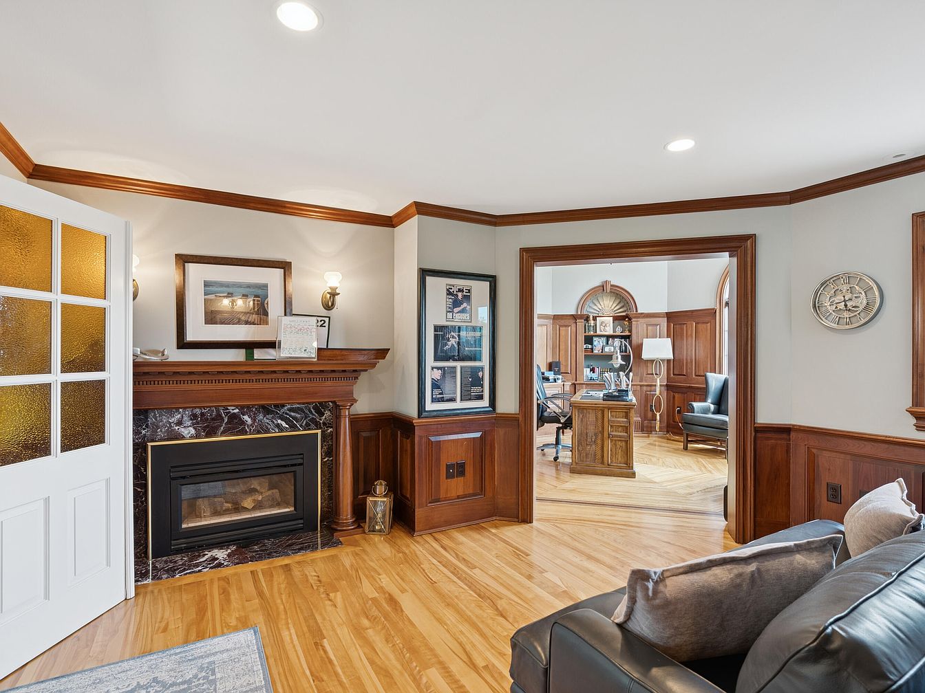 Warm hardwood floors and rich wood paneling create an inviting atmosphere in this transitional space leading to a home office. A marble-trimmed fireplace with a wooden mantle is set against a soft beige wall, accented by brass wall sconces and framed artwork. The doorway to the study features intricate woodwork and opens to a room with a grand wooden desk, tall bookcases, and a deep blue armchair, highlighted by natural light from arched windows. A modern clock decorates the wall, and plush seating with neutral-toned pillows enhances the cozy, sophisticated feel.