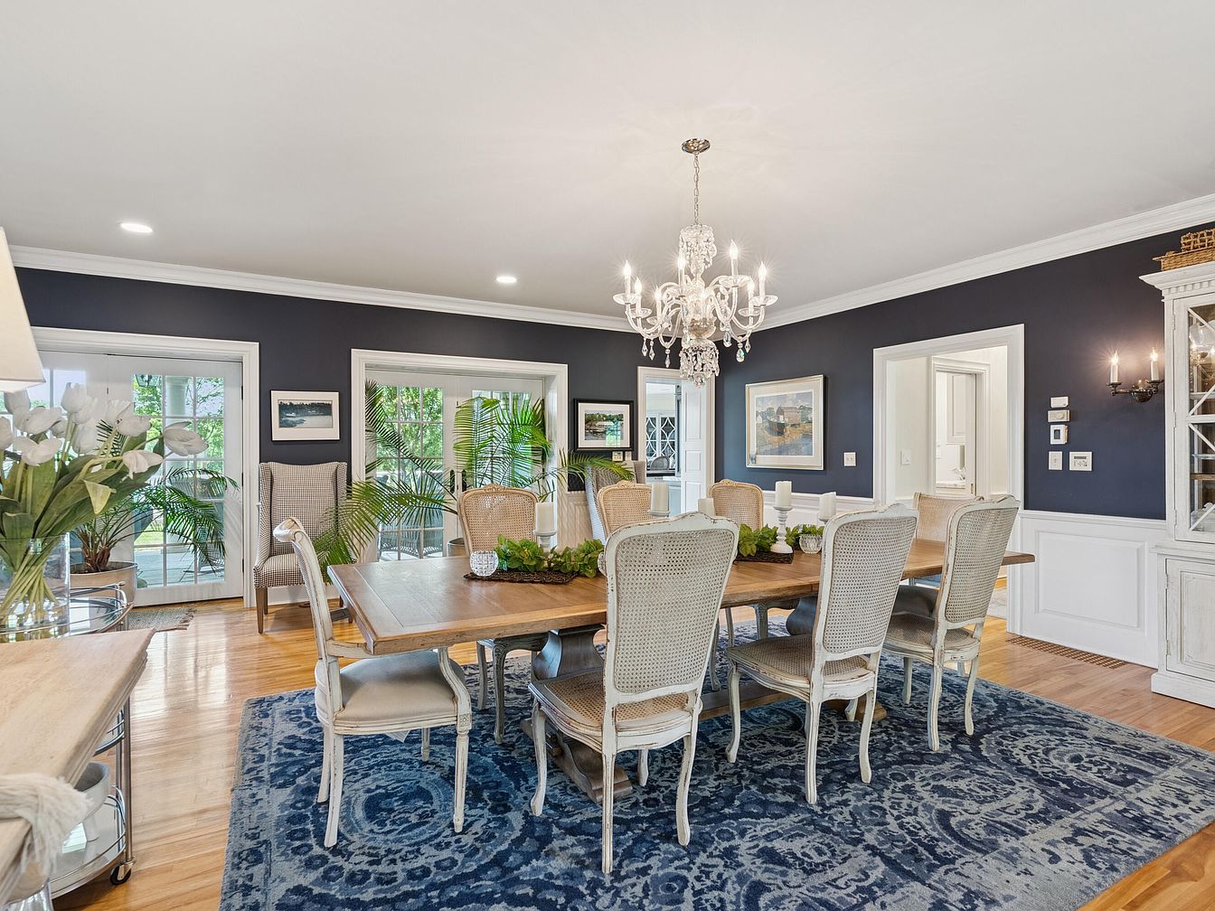 A spacious dining room features a long wooden table with seating for ten. The room exudes elegance with deep navy-blue walls accented by crisp white crown and chair rail moldings. A crystal chandelier adds sparkling sophistication above the table, while a patterned blue area rug defines the dining area on polished wood floors. Wicker-backed chairs provide a touch of vintage charm. Large glass doors on one wall allow ample natural light and offer views of lush green plants both inside and outside. Decor includes framed art, an ornate glass-fronted cabinet, fresh tulips, and greenery for a refreshing, lively feel.