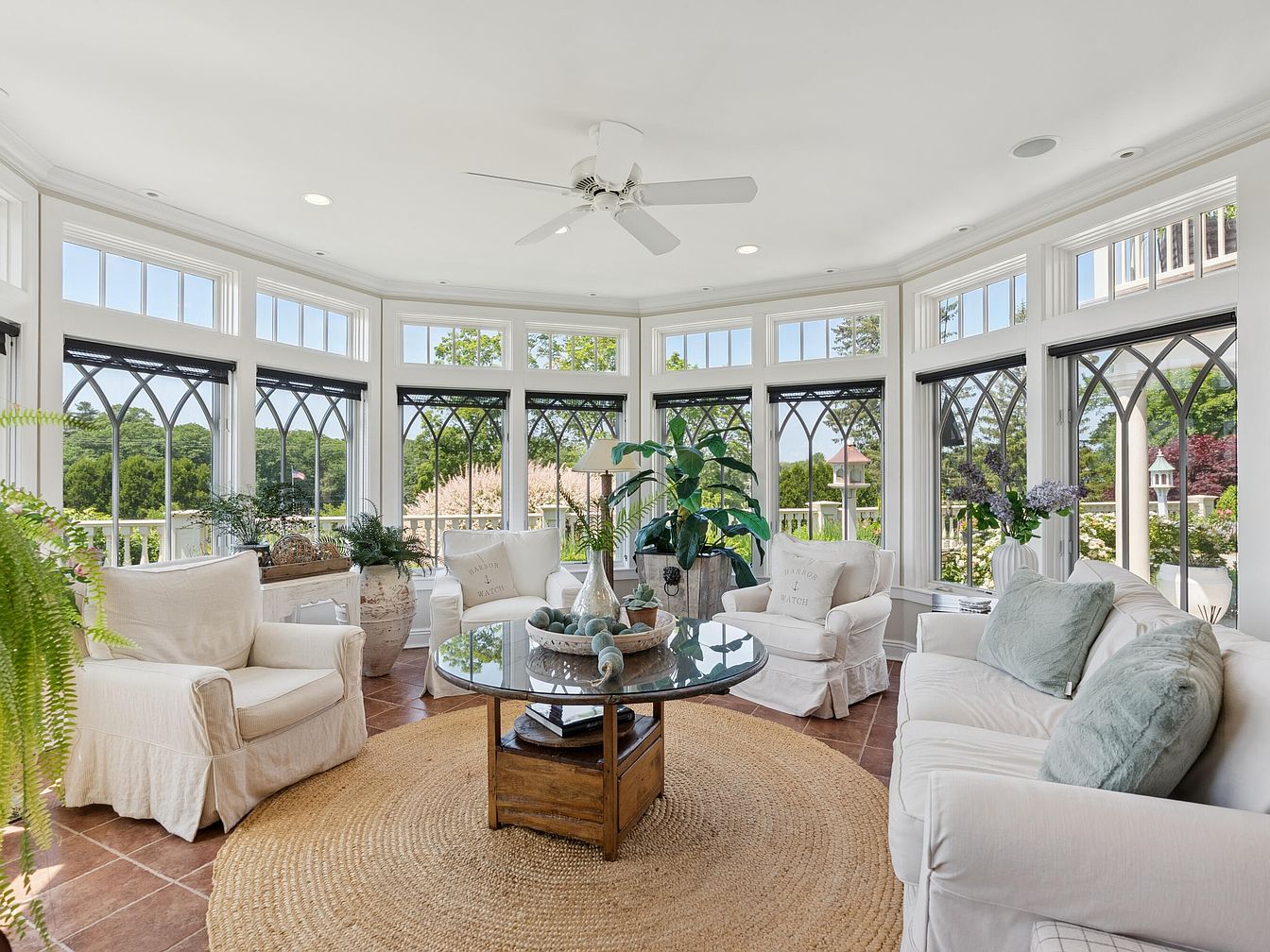A bright, airy sunroom featuring a semi-circular arrangement of overstuffed white armchairs and a sofa accented with pale green pillows, all resting on terra cotta tile flooring. A large round jute rug anchors a glass-topped coffee table with a wooden base. The room is encased by tall windows with decorative black muntins, letting in abundant natural light and offering lush green outdoor views. Several large potted plants add life and freshness, while the ceiling is painted white and fitted with recessed lighting and a central ceiling fan for comfort. The overall atmosphere is tranquil and inviting, with a casual yet elegant coastal aesthetic.