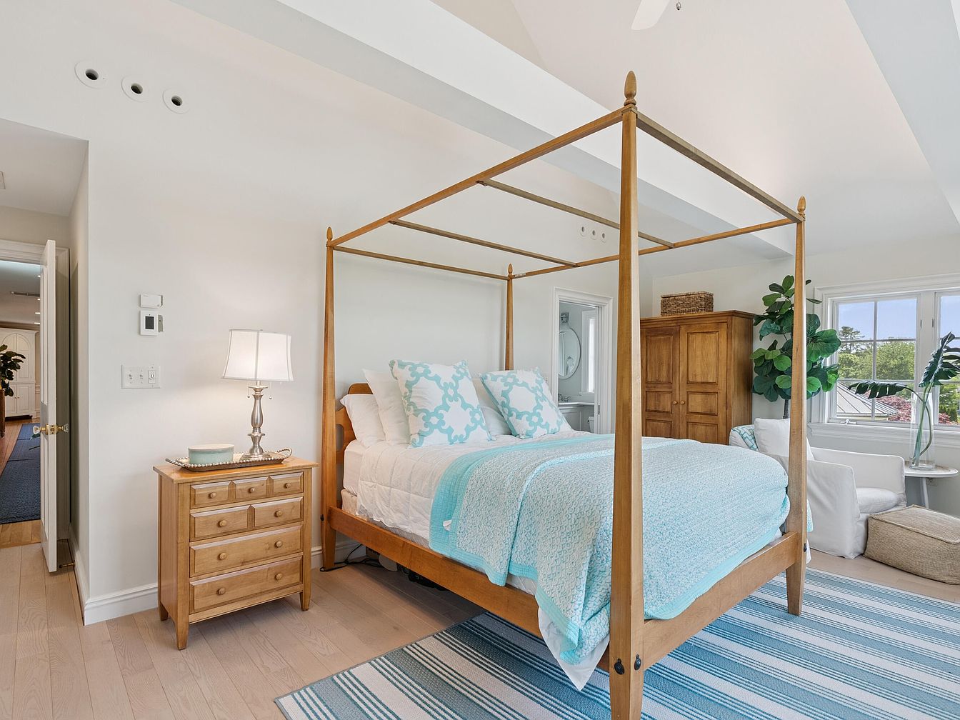 A spacious and airy bedroom featuring a light wood four-poster bed dressed in soft blue and white bedding. The color scheme is serene, with crisp white walls and high beamed ceilings creating an open, inviting feel. A matching wooden nightstand with a classic table lamp sits beside the bed, providing warm, ambient light. Across the room, a large wooden armoire adds storage and rustic charm. A cozy reading nook with a white armchair and ottoman sits by the window, accompanied by a potted plant for a touch of greenery. The striped area rug in blue hues ties the whole space together.