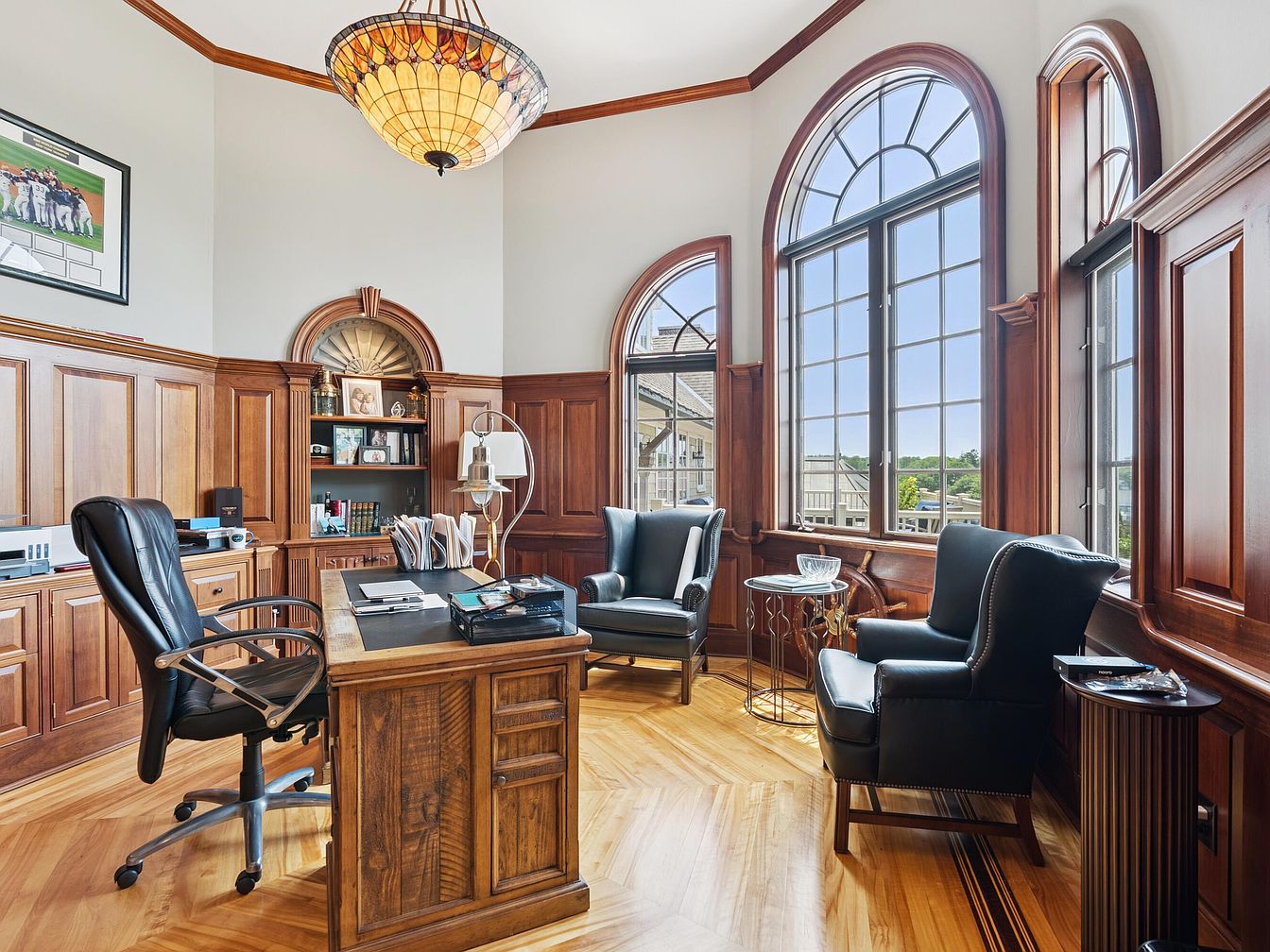 This space features a sophisticated home office bathed in natural light from three large arched windows with dark wood framing. Rich wood paneling lines the walls and is complemented by elegant herringbone-patterned flooring. A classic wooden desk sits centrally, paired with a black leather office chair. Across from the desk, two black leather wingback chairs are positioned around a small ornate side table, creating an inviting conversation area. An eye-catching stained glass chandelier hangs from a detailed ceiling. The office is accessorized with personal photos, books, and upscale decor, exuding warmth and traditional elegance.