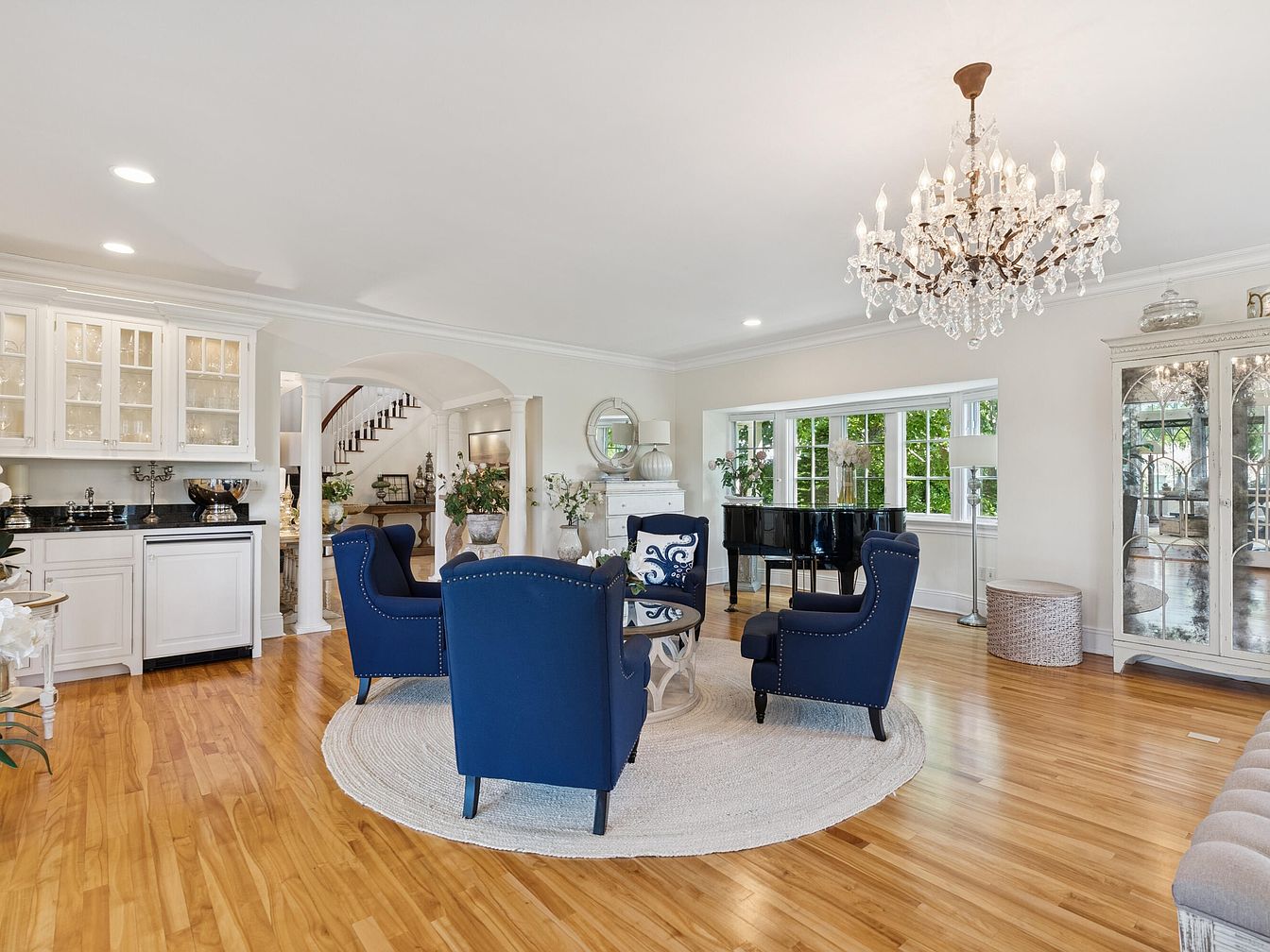 An airy living room features honey-toned hardwood floors and ample natural light from a wall-sized window overlooking a garden. Four navy blue armchairs with nailhead trim are arranged in a circle atop a light woven rug, providing an inviting conversational space. A glass-topped grand piano rests near the window, doubling as a focal piece. Elegant white cabinetry with glass-paneled doors lines one wall, balancing a dark countertop. Crown molding, an ornate crystal chandelier, and a mirrored china cabinet add classic touches, while fresh flowers and silver accents soften the space, creating a refined yet approachable atmosphere.