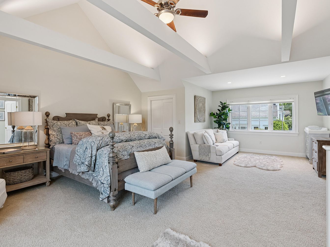 A spacious master bedroom features a vaulted ceiling with exposed white beams and a ceiling fan with wooden blades. The bed has a carved wooden frame and is layered with patterned blue and gray bedding, flanked by matching nightstands with lamps and mirrors. At the foot of the bed sits an upholstered bench. Across the plush beige carpet, a cozy sitting area includes a white loveseat, decorative pillows, and a soft faux fur rug. Large windows allow natural light to fill the room, accentuating soft neutral wall colors, simple artwork, and potted greenery for a relaxing atmosphere.