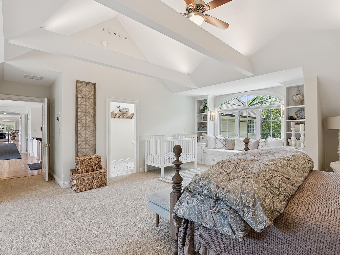 Spacious bedroom with vaulted ceilings, featuring exposed white beams and a ceiling fan with wooden blades. The color palette is soft and neutral, dominated by cream and taupe tones. A large window nook with built-in shelving and cushioned seating is set into an alcove, accented by decorative pillows and pottery. Beside the large wooden bed, a baby’s crib sits in a sunlit corner. The floor is carpeted, enhancing the cozy atmosphere. Two woven baskets and an ornamental wall panel add texture near the entryway, while glimpses of a polished wood hallway extend beyond the room.