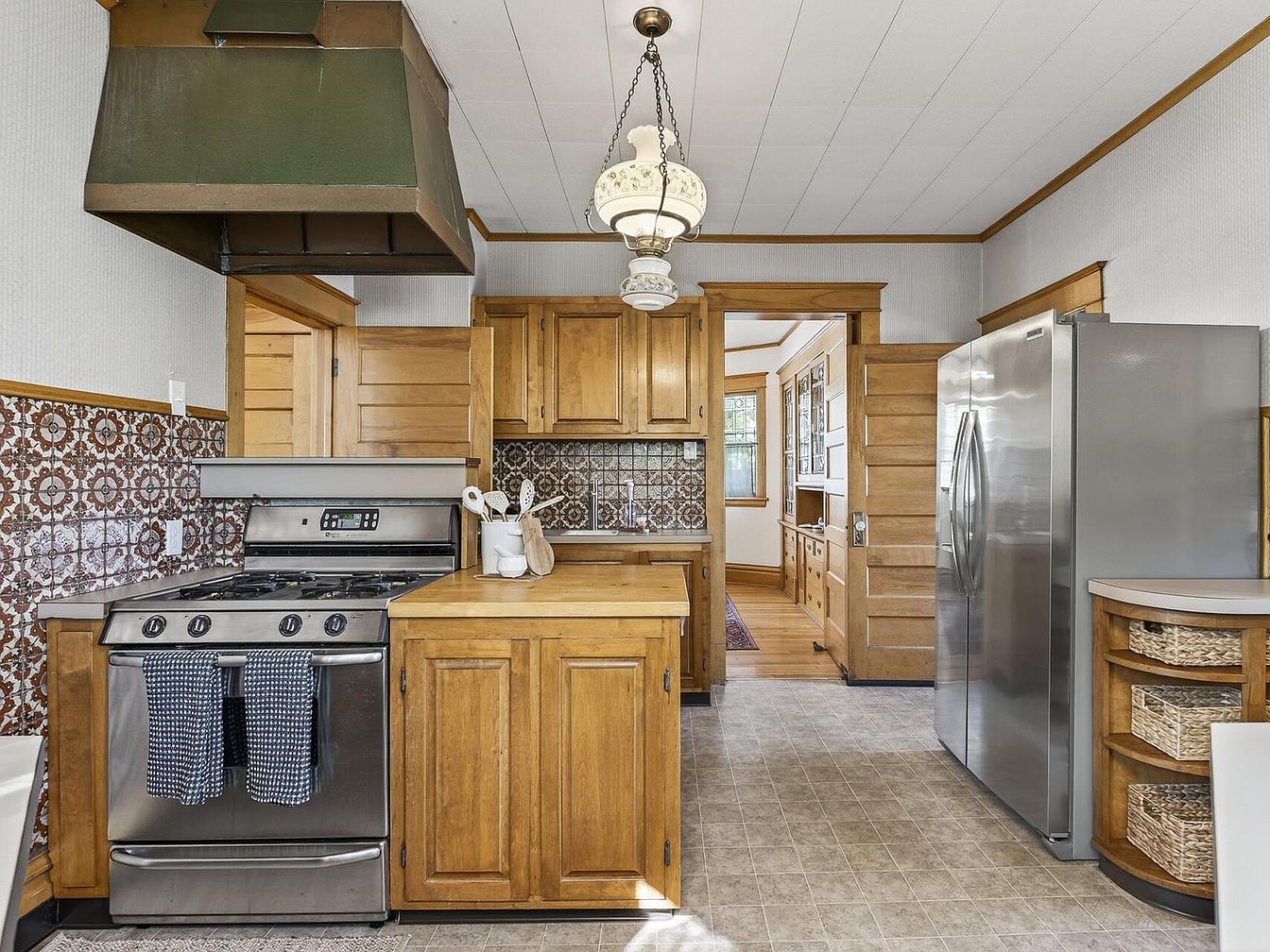 Warm wood cabinetry lines the kitchen, complemented by a stainless steel gas stove and refrigerator, adding a modern touch to the space. The backsplash features a vintage-inspired patterned tile with shades of brown and cream, infusing character and charm. Overhead, a classic pendant light fixture glows softly, while ample counter space provides room for meal preparation and family gatherings. Organized basket shelving enhances functionality, making storage convenient for busy families. The open layout connects smoothly to an adjacent dining room or hallway, creating an inviting, communal atmosphere ideal for both everyday living and entertaining. Neutral flooring and honey-toned trim tie the cozy, family-friendly ambiance together.