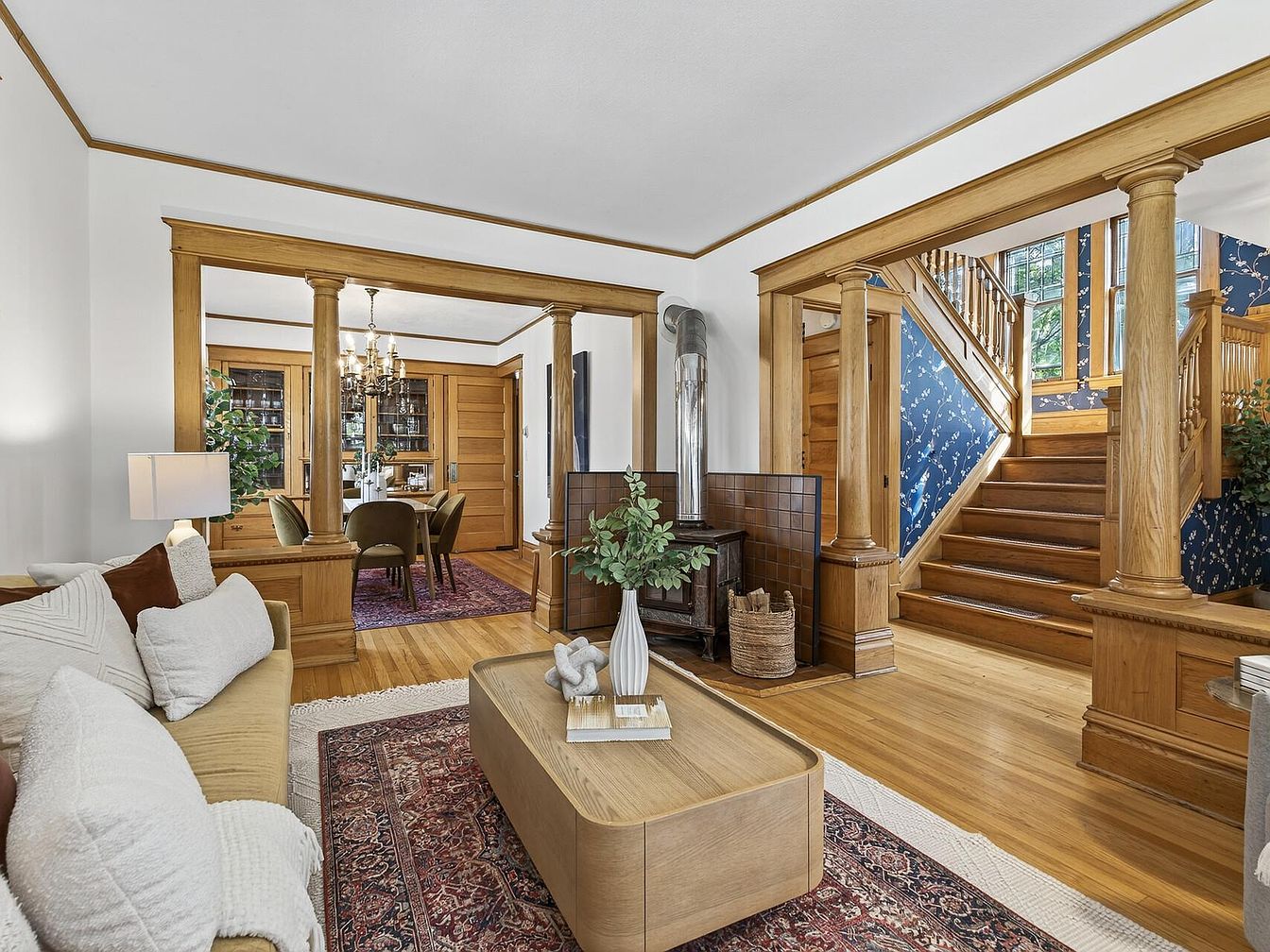 Warmth and elegance define this open living room entry, featuring rich honey-toned wood trim and architectural columns that create a sense of separation between spaces while maintaining an open flow. The room includes a plush beige sofa accented with cozy, textured pillows, ideal for family lounging, paired with a contemporary wooden coffee table atop a traditional patterned area rug. Off the main space, a formal dining area with an antique chandelier and glass-front cabinets promises family gatherings. Nearby, a stunning staircase with blue patterned wallpaper leads upward, all bathed in soft, natural light. The atmosphere is inviting, stylish, and highly functional for family living.