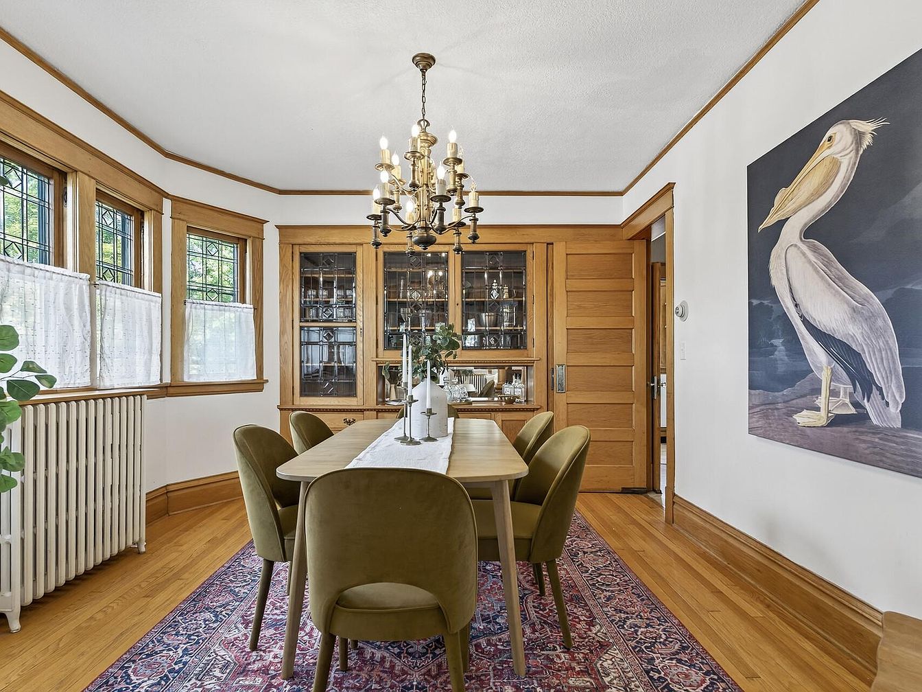 A bright and welcoming dining room features a large wooden table surrounded by six olive-green upholstered chairs, set atop a richly patterned area rug in shades of red and blue. The room is trimmed with natural wood, including elegant baseboards, window frames, and a built-in china cabinet with glass doors that display fine dishware. Three multi-paned windows let in ample light, adorned with half-length white curtains for privacy. A classic brass chandelier hangs above the table, adding a warm touch. The space is accented by a large painting of a pelican on the wall, lending charm. Spacious, practical, and ideal for family gatherings.