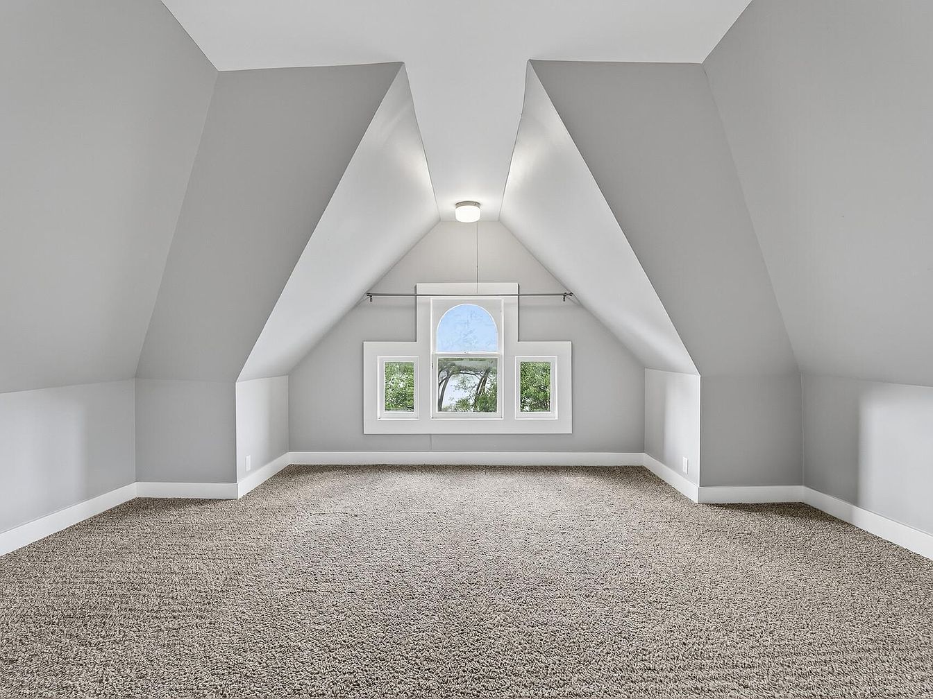 This spacious attic retreat features dramatic vaulted ceilings with modern angular lines, creating a bright and airy atmosphere. Fresh light gray walls complement the soft, neutral-toned carpeting, making the space inviting and comfortable for families. Large windows at the end wall, including a charming arched centerpiece, flood the room with natural light while offering views of the greenery outside. Clean white trim adds a crisp finish to the subtle color palette. The open, uncluttered layout provides ample room for a play area, family gatherings, or a cozy reading nook, making it versatile for family needs and activities.