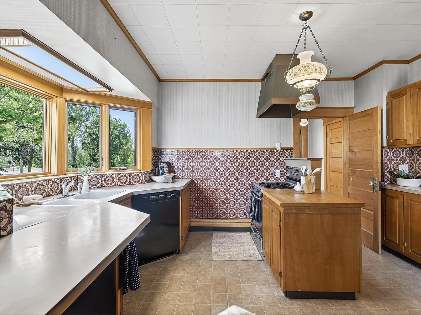 Spacious and bright, this kitchen features a large bay window that lets in ample natural light and offers a beautiful view of the lush greenery outside. The room is designed with family use in mind, including generous countertop space and an island for meal prep or casual gatherings. Warm wooden cabinetry and doors create a cozy, welcoming feeling, while the backsplash with intricate red and brown geometric tiles adds a vintage charm. Neutral off-white counters and modern black appliances blend functionality and style, and pendant lighting provides a soft, classic glow. The open-plan layout encourages family interaction and easy movement.