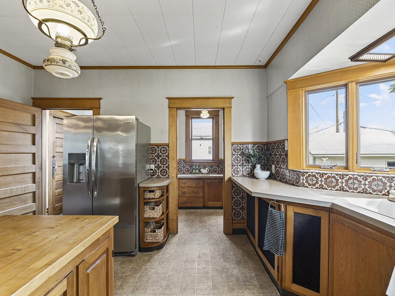 Spacious, family-friendly kitchen with abundant natural light streaming through a large set of windows above a wraparound white countertop, ideal for meal prep or casual gatherings. Warm wood cabinetry and trim create a cozy, welcoming atmosphere, complemented by decorative tile backsplashes featuring intricate brown and beige patterns. Stainless steel refrigerator provides plenty of storage, while open shelving with woven baskets ensures easy access to everyday essentials. Neutral walls and linoleum floors offer a clean, timeless look, and the vintage-style hanging light fixture adds charm. The generous counter space and functional layout make it perfect for daily family activities and entertaining.
