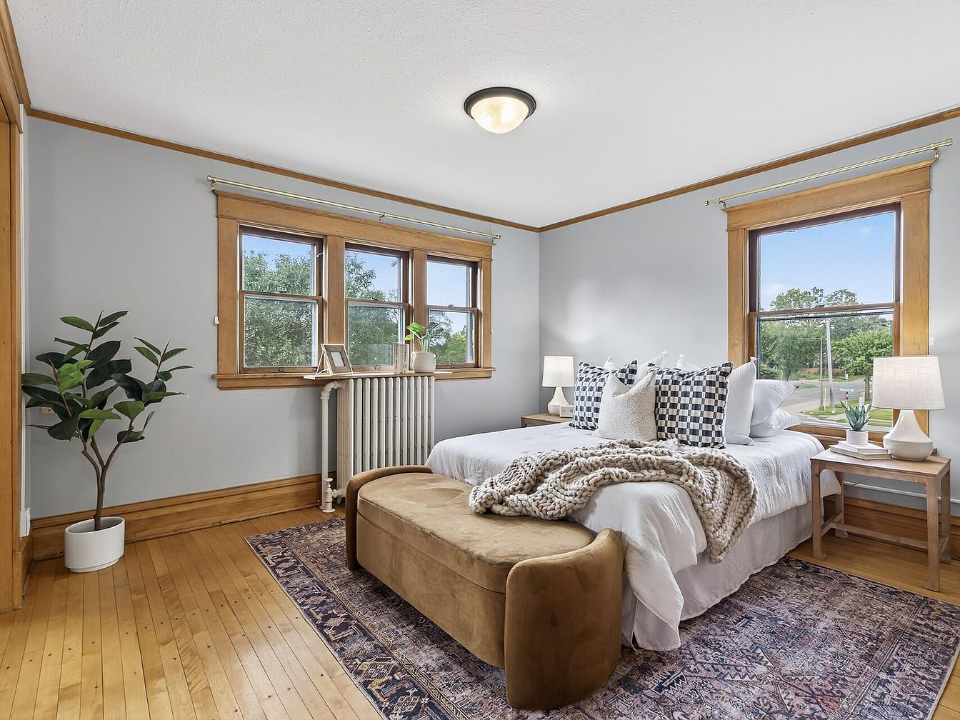 This inviting bedroom features warm hardwood floors and large wooden-framed windows that fill the space with natural light, offering wonderful views and a sense of openness. A plush bed with checkered and textured pillows sits centrally, accompanied by a cozy throw blanket, creating a comfortable spot for rest. Beside the bed, matching wooden nightstands hold white lamps and houseplants, adding softness and a homely touch. An elegant suede bench at the foot of the bed provides extra seating, while a dark patterned area rug grounds the room. Soft gray walls and leafy greenery further enhance the welcoming, family-friendly atmosphere.