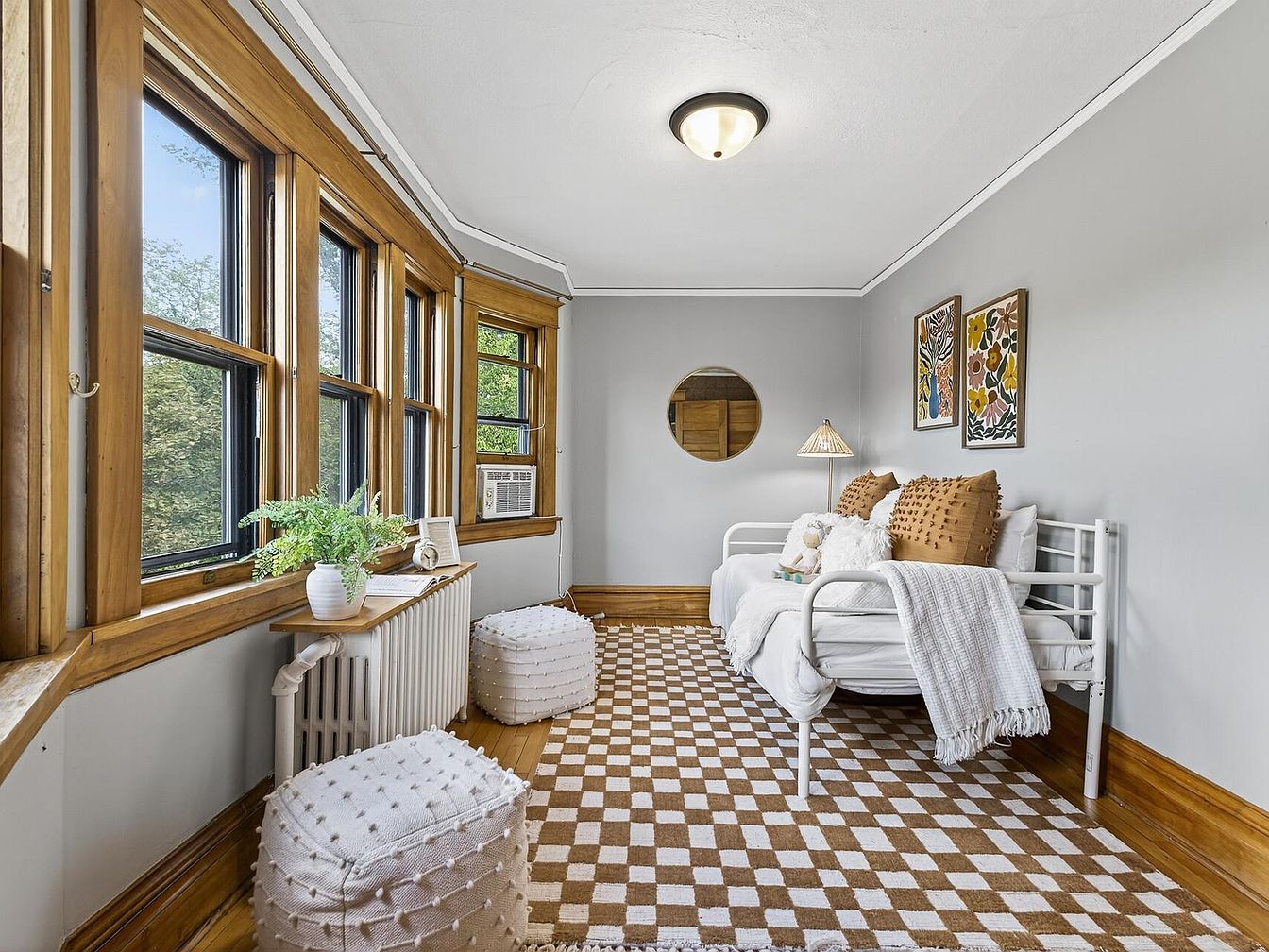 A bright and inviting sunroom features a cozy daybed with textured pillows and a soft white throw, perfect for relaxing or reading. Large bay windows framed with warm wood trim fill the space with natural light, creating a cheerful atmosphere and offering unobstructed views of lush greenery outside. Two plush, white poufs provide extra seating or a soft spot for children to play. The checkered brown and white area rug brings playful energy to the room, complementing the neutral gray walls and natural wood accents. Vibrant artwork and a round mirror add personality, making this a welcoming, family-friendly retreat.