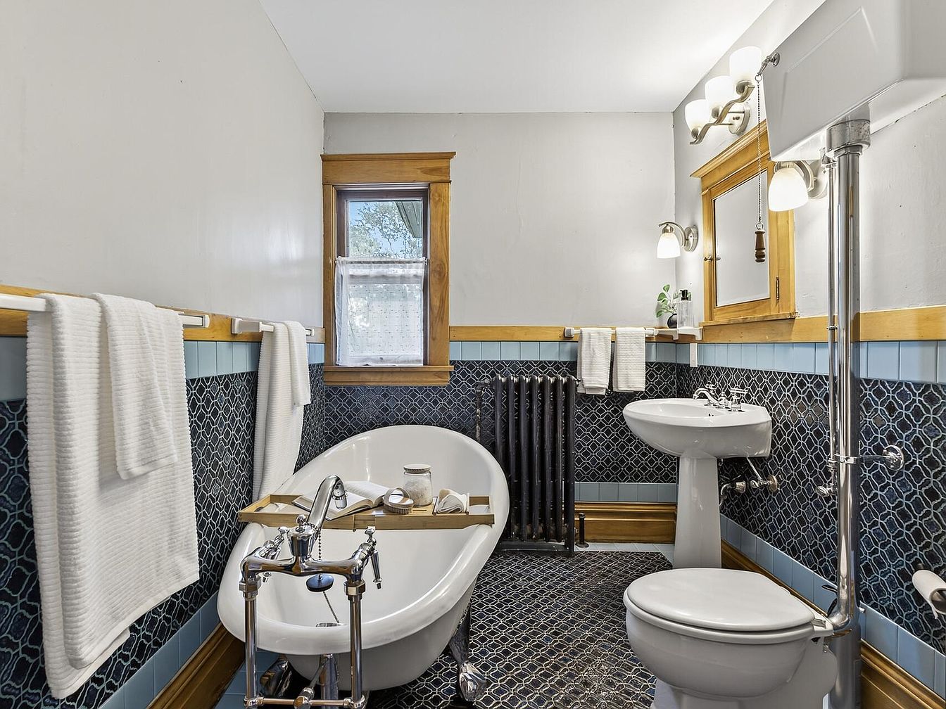A family-friendly bathroom featuring a classic clawfoot bathtub at the center, accented with a sleek chrome faucet and a wooden bath caddy for added convenience. The walls are adorned with striking dark blue geometric patterned tiles, complemented by powder blue tile trim and natural wood accents around the window and wall edges. Crisp white towels hang on sturdy racks, enhancing the inviting, clean atmosphere. The pedestal sink and high-tank toilet evoke a timeless charm, while soft, warm lighting above the mirror and window creates a welcoming glow. Ideal for family routines, the design combines comfort, practical storage, and tasteful elegance.