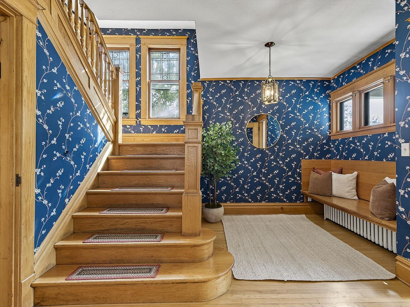 A warmly lit foyer with an inviting wooden staircase occupies the foreground, leading up from the right side of the image. Deep blue floral wallpaper adorned with delicate white blossoms is paired with natural wood trim throughout, creating a cheerful yet classic atmosphere. This family-friendly entryway features a spacious built-in wooden bench along one wall, topped with plush earth-toned and cream pillows for comfortable seating, perfect for taking off shoes or waiting together as a group. A large, light-colored area rug softens the wooden floors, while a round mirror, leafy green potted plant, and a pendant lantern light fixture add charm and style to the welcome space.