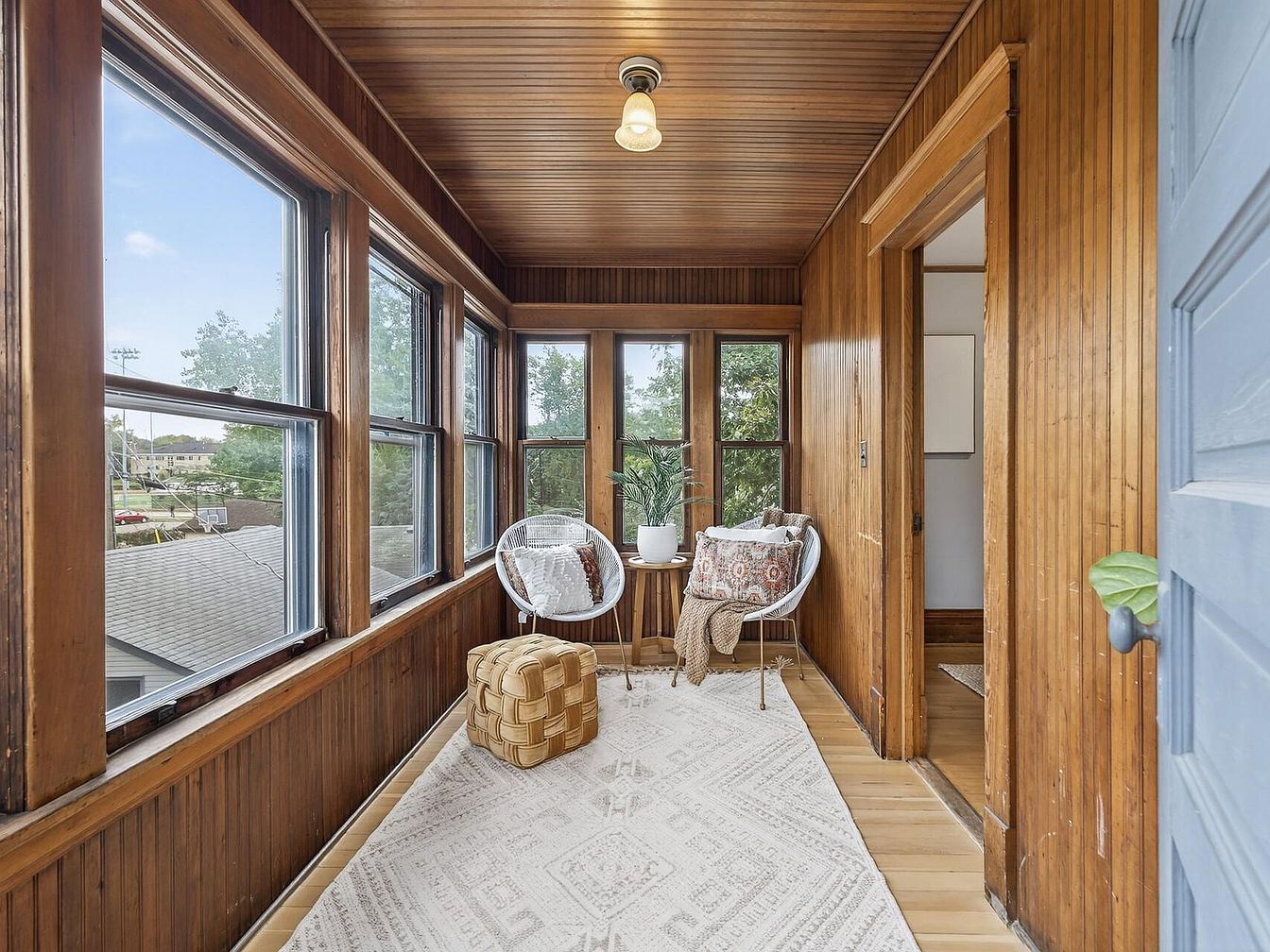 A bright and inviting sunroom featuring warm wooden paneling on the walls and ceiling, creating a cozy and nostalgic ambiance. The space is filled with natural light from a row of large windows on two sides, offering charming views of the neighborhood and treetops. Two comfortable white chairs with plush cushions are arranged around a small round table, ideal for family conversations or enjoying morning coffee. A soft, cream-colored patterned rug covers the floor, adding texture and comfort perfect for children at play. An ottoman and potted plant add a touch of homeliness, making this space family-friendly and welcoming.