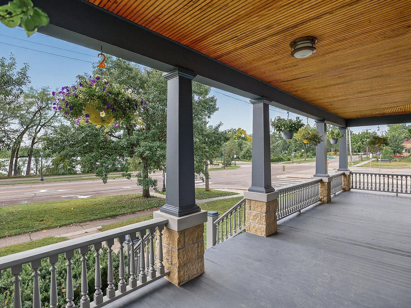 A welcoming and expansive front porch with wide floorboards painted a deep gray-blue, ideal for relaxing or gathering with family. Sturdy stone and wood columns support a honey-toned, slatted wood ceiling that adds warmth and character to the space. The porch is framed with decorative, light-gray balustrades that provide safety for children while maintaining an open, airy feel. Hanging flower baskets with vibrant blooms add pops of color, complementing the neighborhood’s lush greenery just beyond the sidewalk. Perfect for outdoor seating, the porch offers a beautiful view of the tree-lined street, encouraging safe outdoor play and neighborly connections.